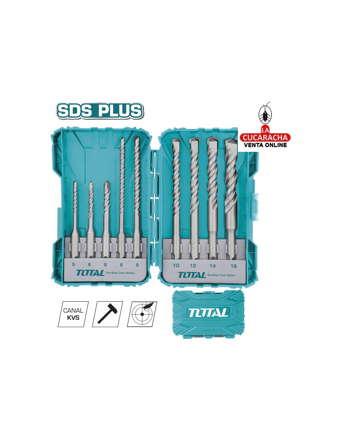 Juego de 9 brocas de pared SDS plus. Medidas 5 x 110 - 6 x 110 - 8 x 110 - 6 x 160 - 8 x 160 - 10 x 160 - 12 x 160 - 14 x 160 - 16 x 160 mm. Perfil parabólico del canal para una mejor evacuación. Resistente al impacto. Mejor centrado de la punta que evita que resbalen en superficies lisas.