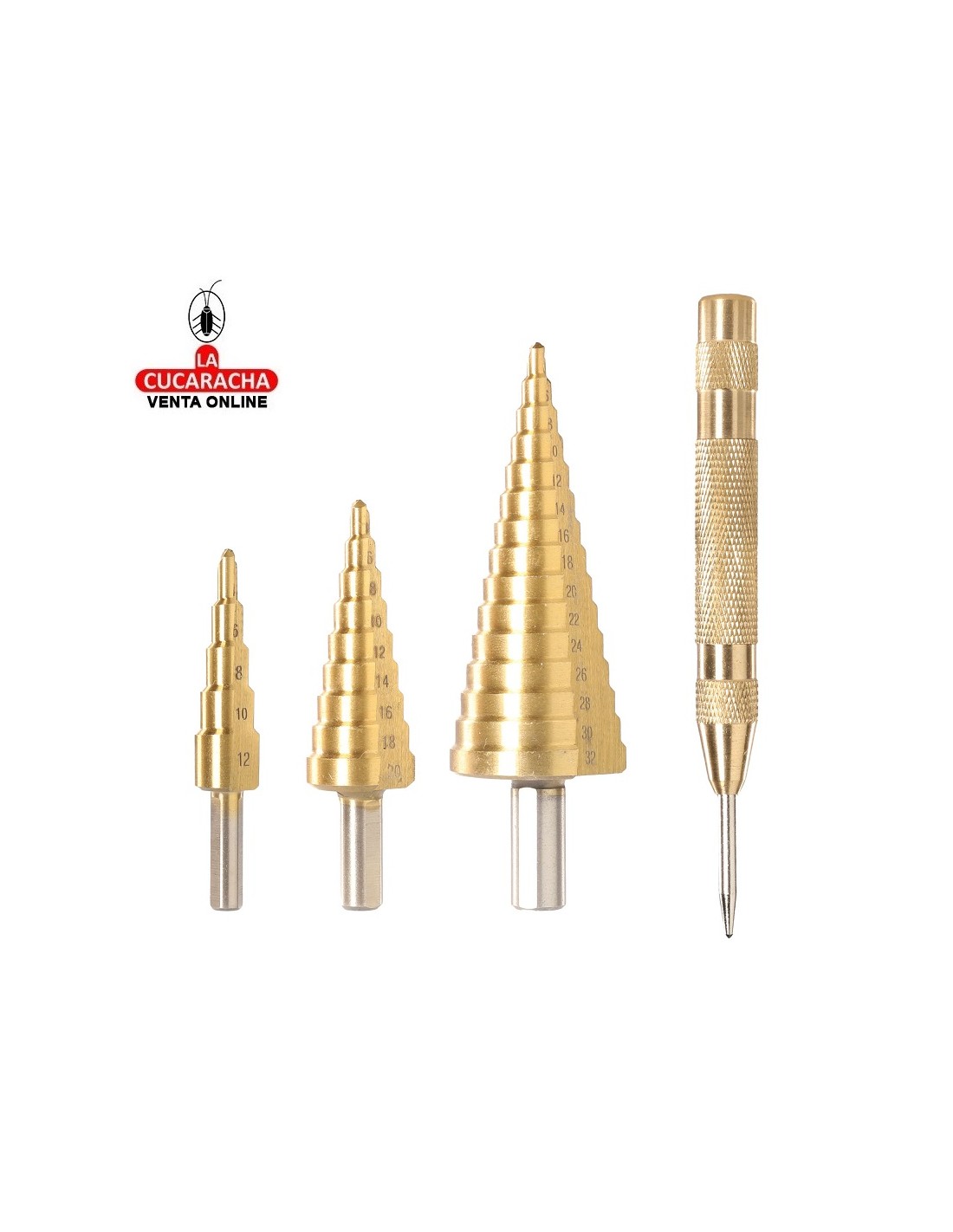Juego de 3 brocas escalonadas y centrador. Broca 4-12 mm, 2 mm escala. Broca 4-20 mm, 2 mm escala. Broca 4-32 mm, 2 mm escala. Fabricadas en HSS 4341.