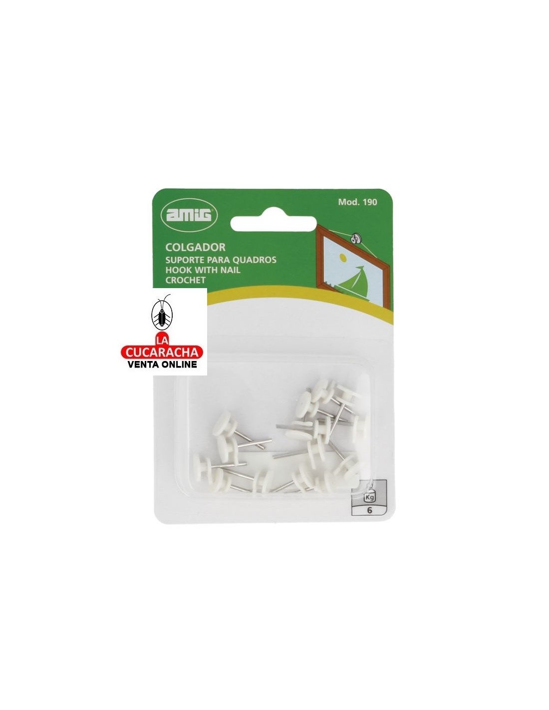 Colgador de cuadros universal. Fijación simple con martillo. Evita dejar marcas en la pared.