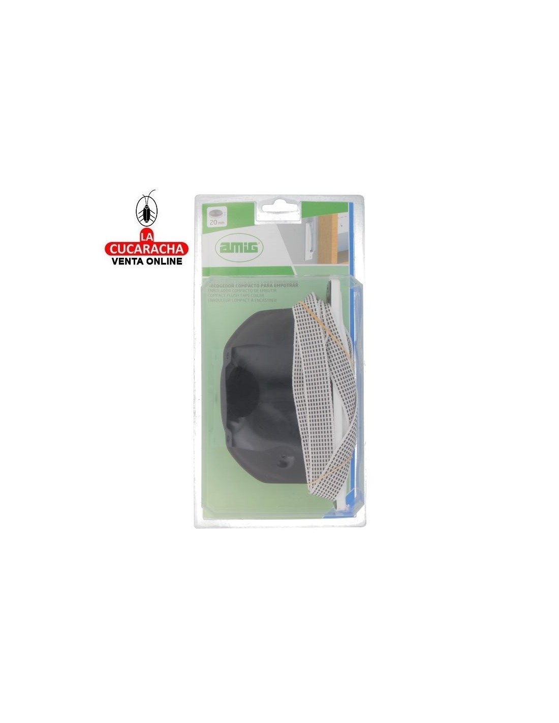 DESCRIPCIÓN: Recogedor de empotrar sin pivote para persianas con frente de plástico. De diseño compacto, sencillo, atemporal y funcional. De instalación fácil y rápida, no tendrá que hacer uso de herramientas especiales DETALLES: De correa giratoria con cinta blanca con pintas negras de 14-20 mm. Frente de PVC. Medidas: 2,8 x 18 x 9 cm (ancho x alto x fondo). Resistente y de gran durabilidad. Podrá encontrar toda la gama de accesorios de persiana disponible en Amig USOS: Facilita la tarea de subir y bajar las persianas sin apenas esfuerzo. Se fija a la pared mediante 2 tornillos. Los recogedores para embutir son muy prácticos y mejoran notablemente la estética del conjunto de la habitación INSTALACIÓN SENCILLA: se coloca en la parte final de la persiana utilizando dos unidades a ambos lados y se sujetan mediante el tornillo central. Los topes quedan orientados hacia la cara exterior de la persiana y actúan como límite para evitar que la persiana se cuele dentro del cajón.
