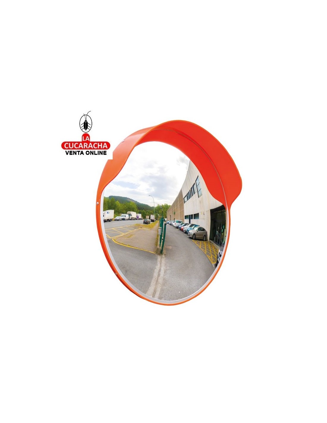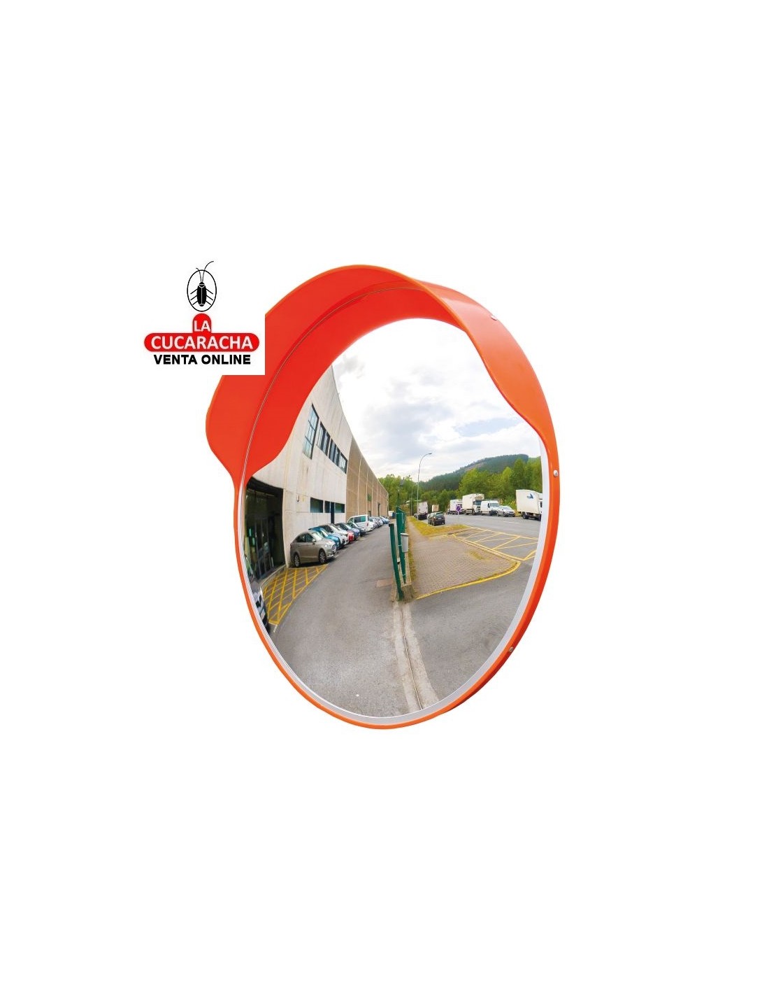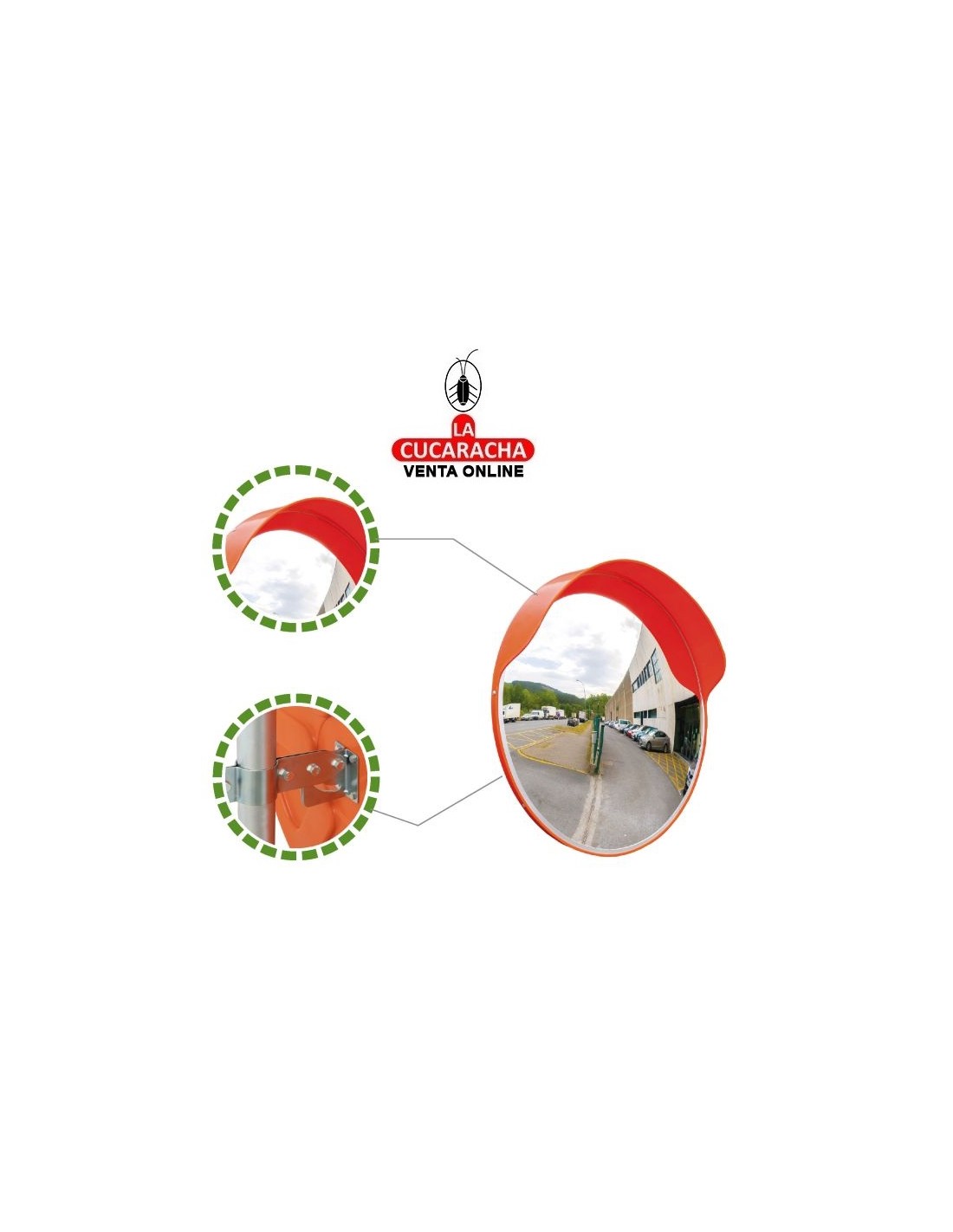 Espejo convexo para seguridad y vigilancia. Adecuado para ángulos y zonas muertas en comercios y garajes. Con tratamiento anti rayos UVA y resistente a la corrosión y al impacto. Se puede fijar a la pared o a un soporte. Incluye las piezas para su anclaje. Incorpora visera superior para protegerlo de la lluvia.