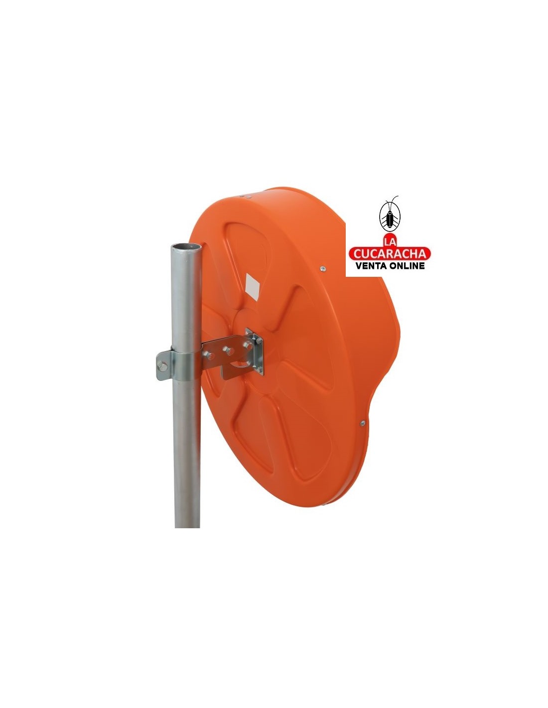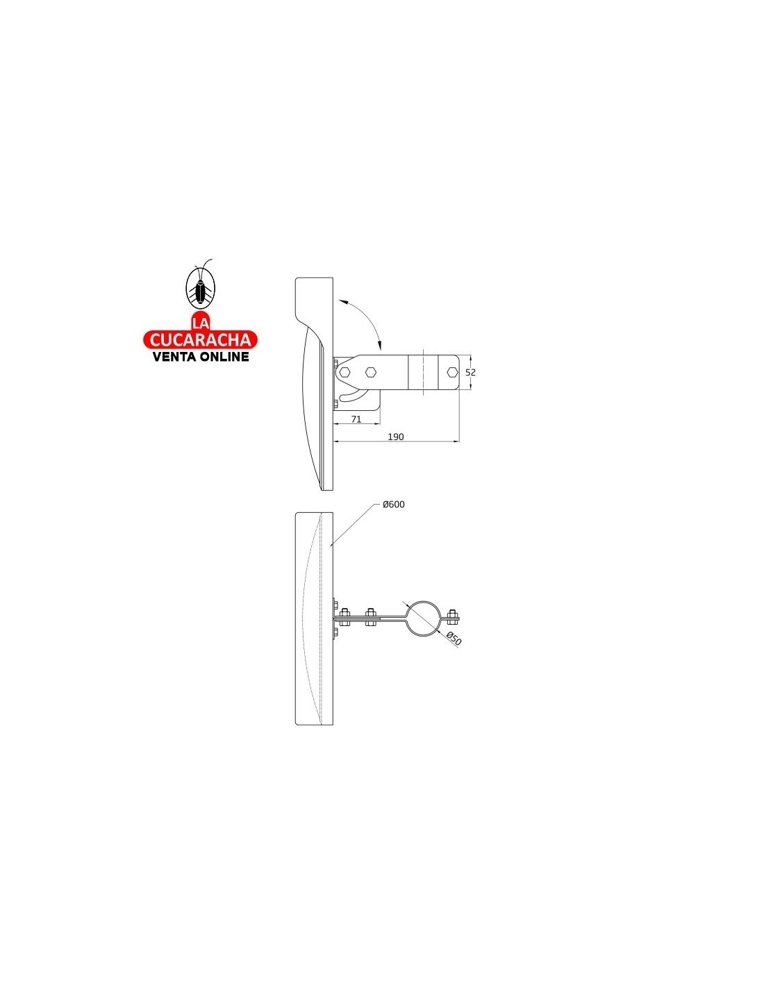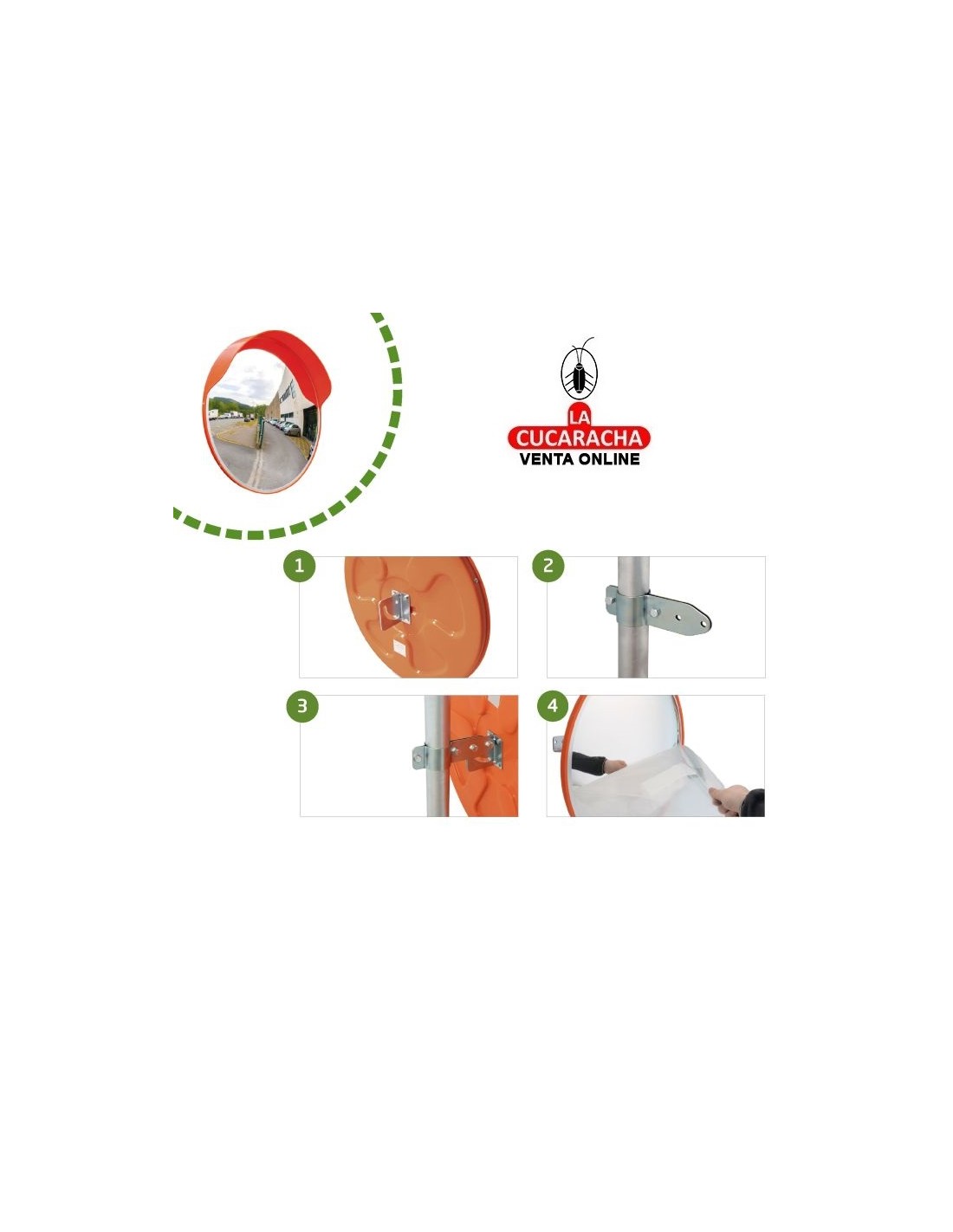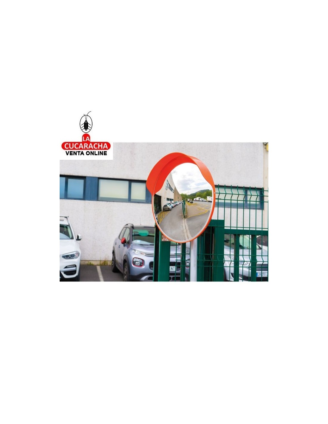 Espejo convexo para seguridad y vigilancia. Adecuado para ángulos y zonas muertas en comercios y garajes. Con tratamiento anti rayos UVA y resistente a la corrosión y al impacto. Se puede fijar a la pared o a un soporte. Incluye las piezas para su anclaje. Incorpora visera superior para protegerlo de la lluvia.