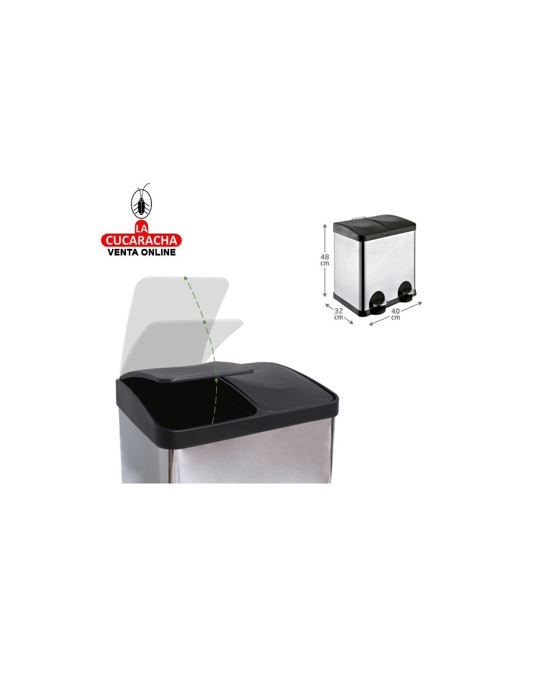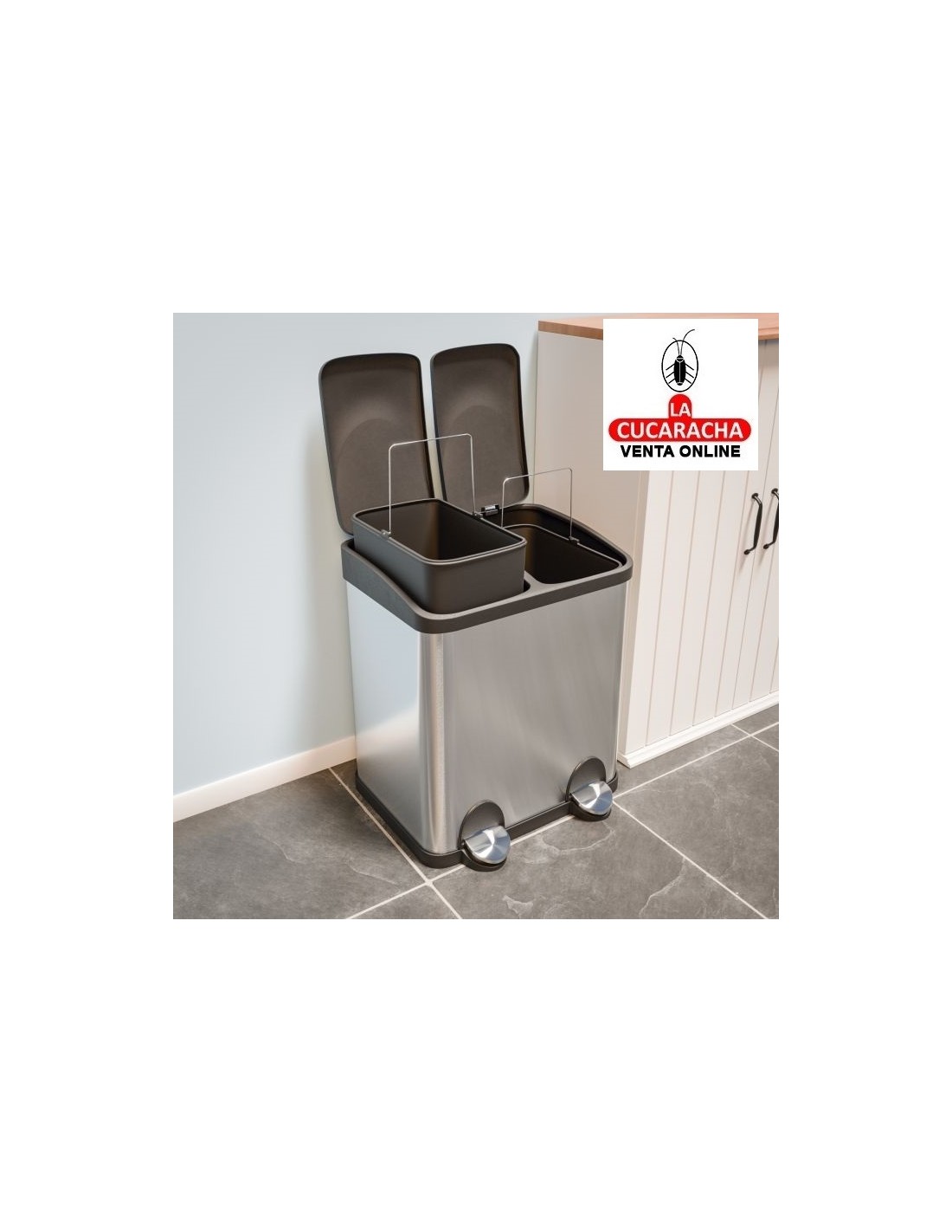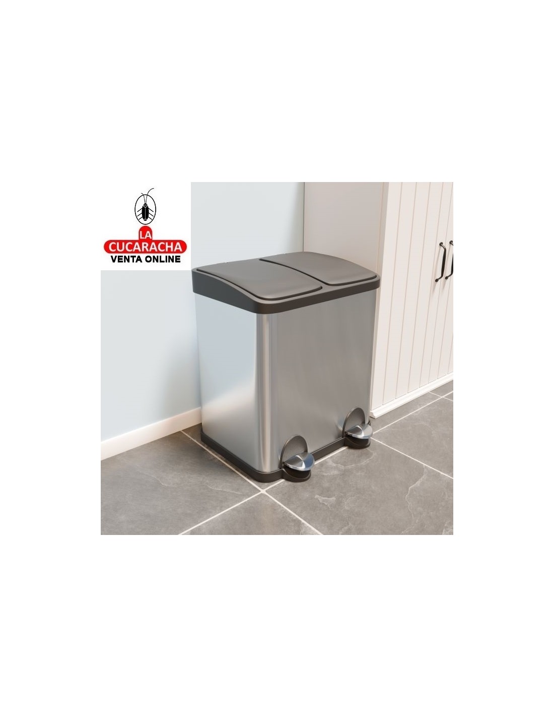 CUBO DE BASURA DE RECICLAJE: Esta papelera de reciclaje doble es una solución innovadora para clasificar y reciclar los residuos con estilo. Con sus pedales de apertura y tapas herméticas, tendrás una experiencia de reciclaje cómoda y sin malos olores USOS: Gracias a sus pedales de apertura independiente, es muy fácil introducir los residuos y reciclarlos por separado. Además, es perfecto tanto para interiores como exteriores y es apto para colocarse en cocinas, oficinas, terrazas o jardines DETALLES: Sus medidas son: 48 x 32 x 40 cm. Ha sido elaborado con acero inoxidable, que destaca por su dureza, resistencia a la tracción y larga vida útil. Cuenta con acabado plateado. Cada cubo posee una capacidad de 15 l. Incluye una base de plástico DISEÑO MODERNO: El acabado plateado en acero inoxidable le da un toque elegante, perfecto para cocinas modernas y clásicas. Tiene un diseño compacto y sencillo