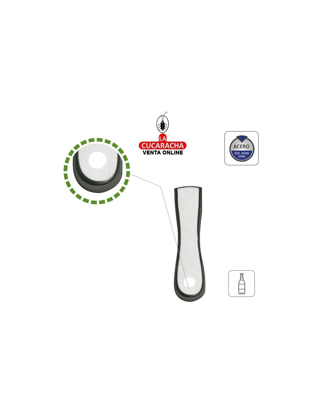 Abretapón en acero. Con orificio para colgar.
