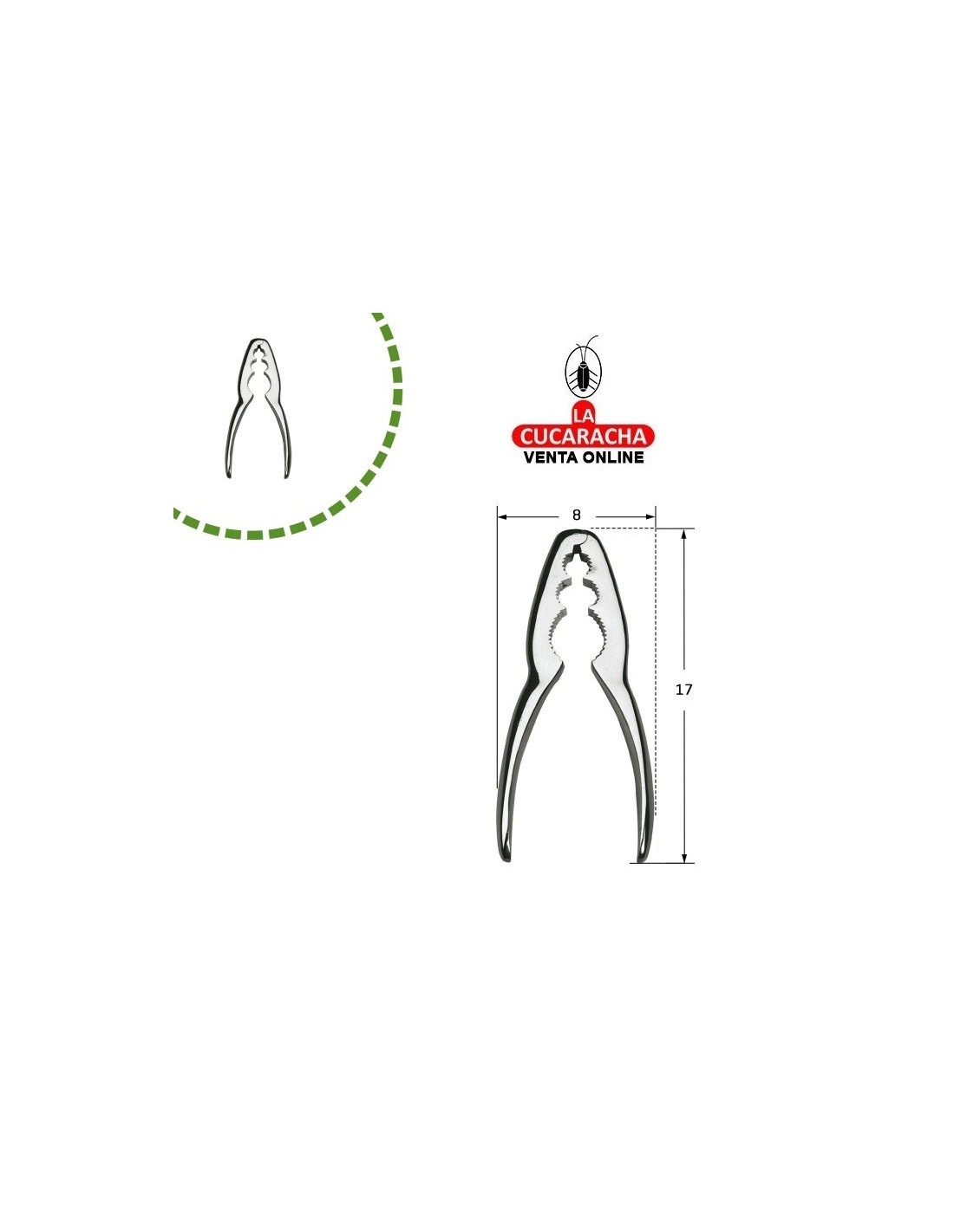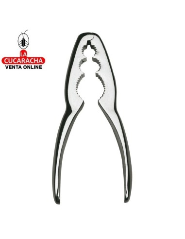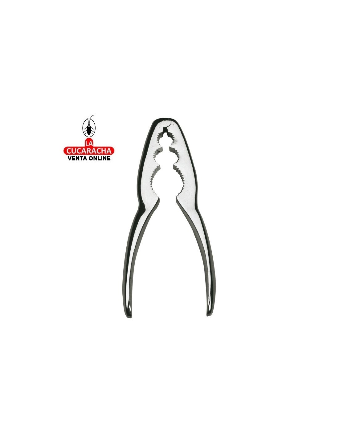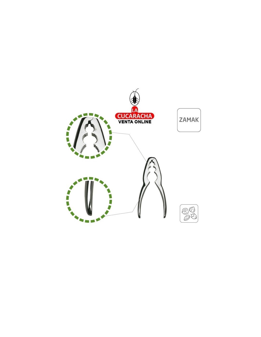 DESCRIPCIÓN: Cascanueces - Marisquero en Zamak macizo. Abridor que cuenta con 3 huecos con diseño de diente de sierra o endiduras dentadas, para un agarre seguro, y dos brazos ergonómicos articulados en uno de sus extremos. DETALLES: Pinza de palanca robusta y duradera fabricada en Zamak con acabado cromado. El Zamak es un material duro, con muy buena resistencia mecánica o a la tracción, gracias a su composición formada por la aleación de varios metales. USOS: Utensilio de cocina indispensable con el que podrá romper nueces de todos los tipos y tamaños, almendras, cacahuetes o avellanas, así como abrir cómodamente y de forma segura cualquier tipo de conchas, patas, pinzas o tenazas de mariscos como el cangrejo, la langosta o las ostras. DIMENSIONES: Su tamaño es de 17 x 8 cm. Tiene un tamaño estándar que se adapta a la mayoría de manos. Es compacto y fácil de almacenar en cualquier cajón junto a tenedores, cuchillos, cucharas y otros utensilios de cocina.