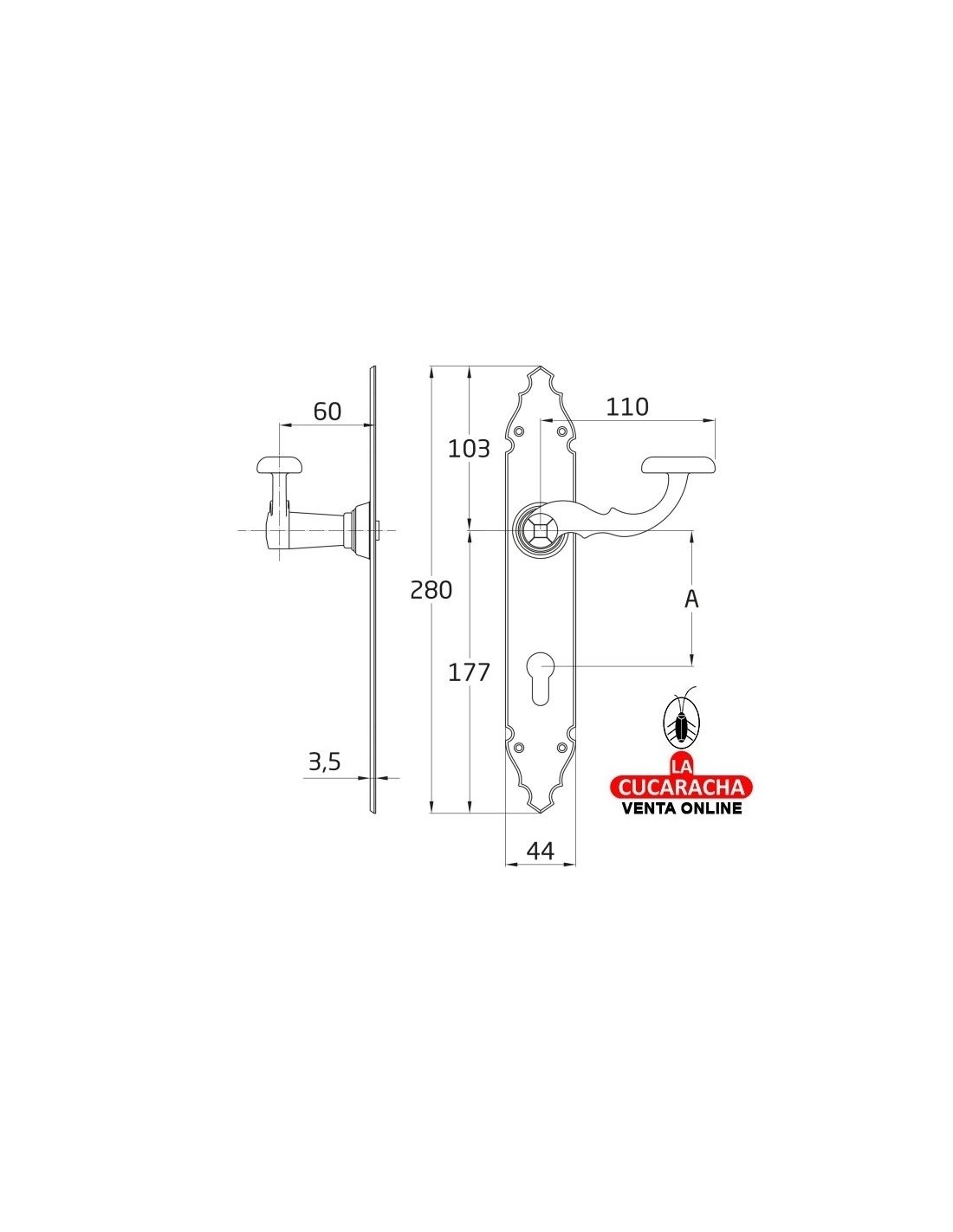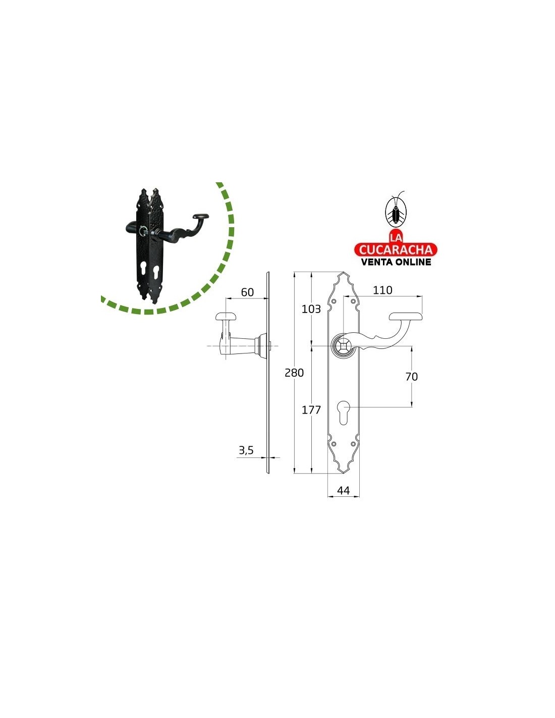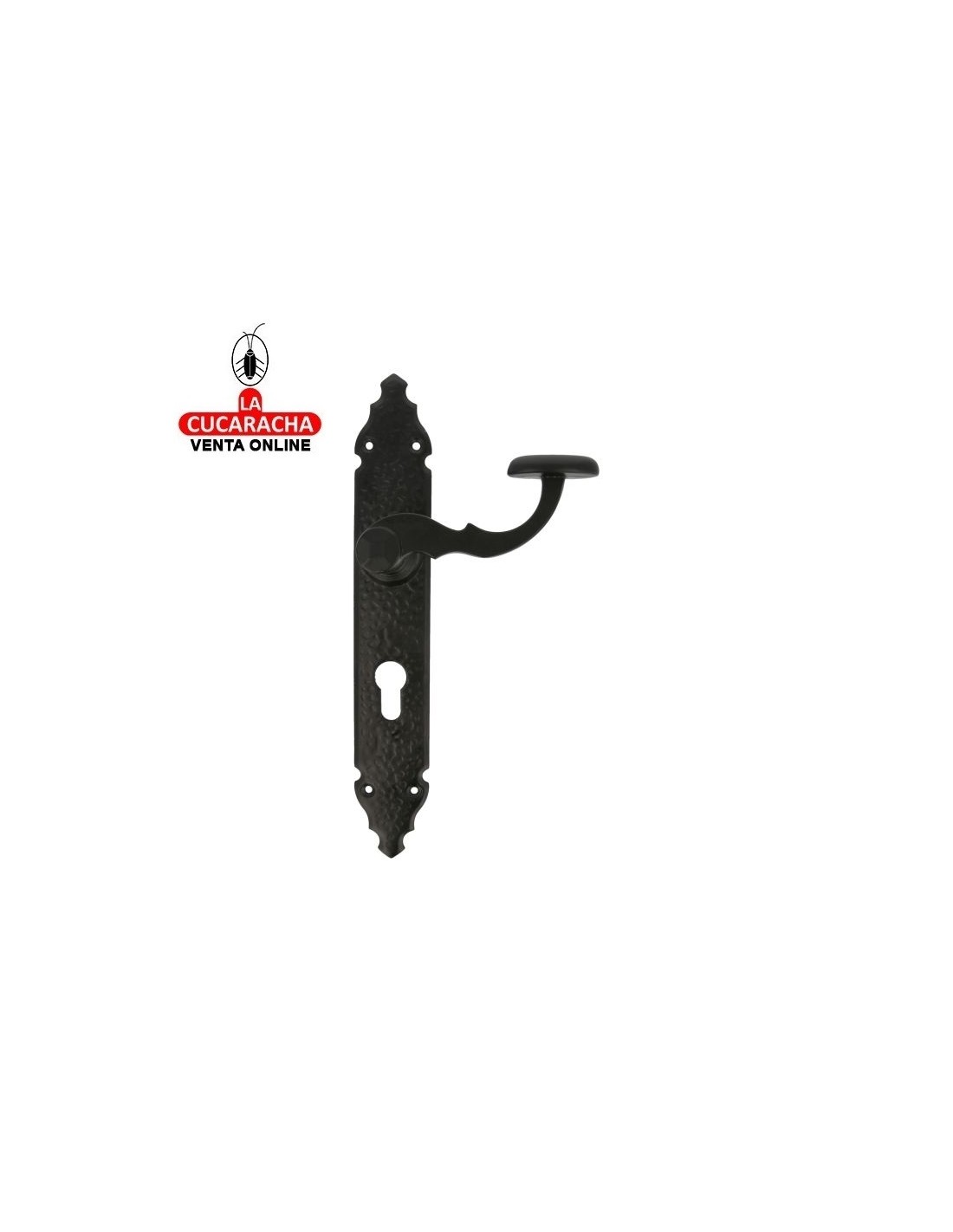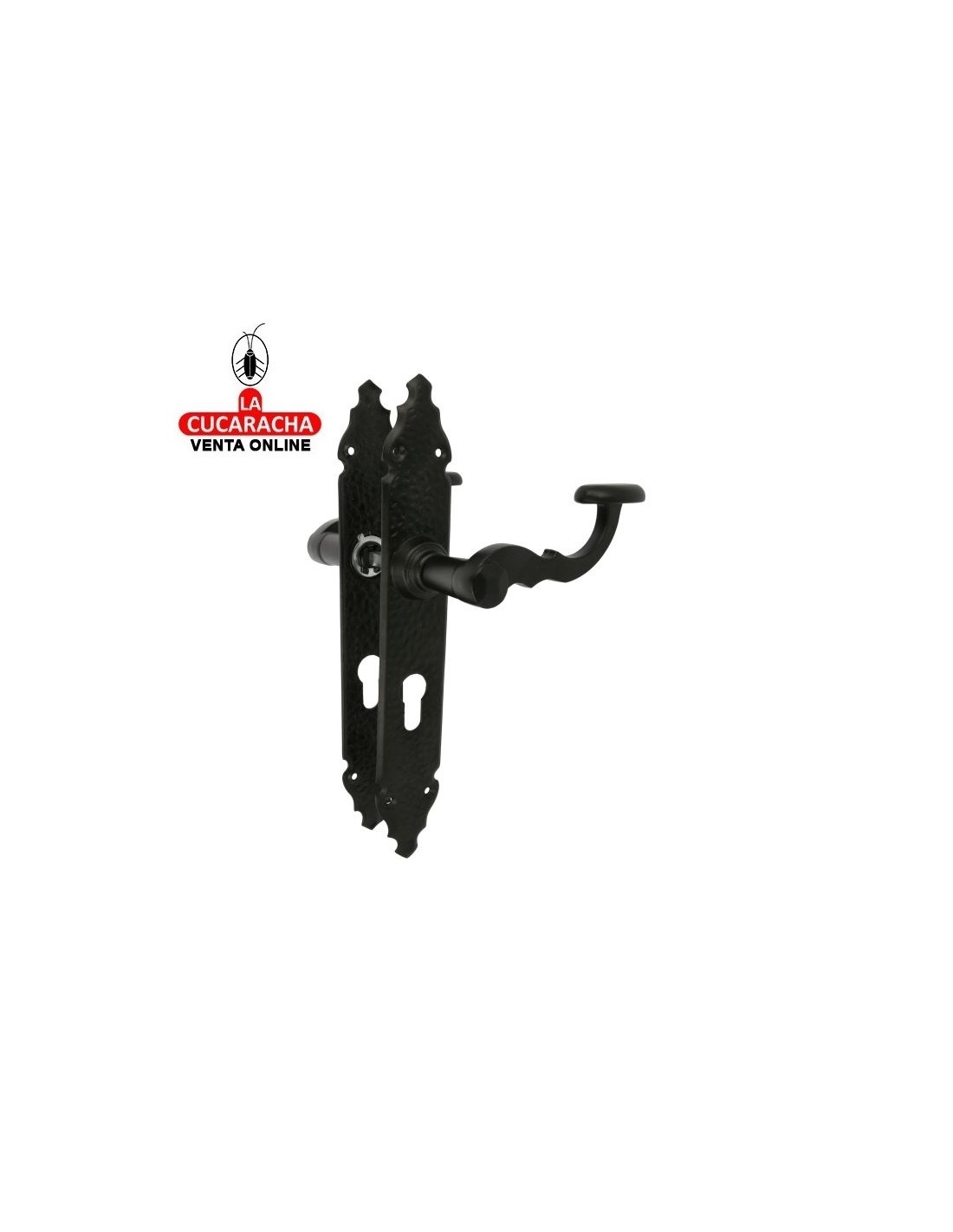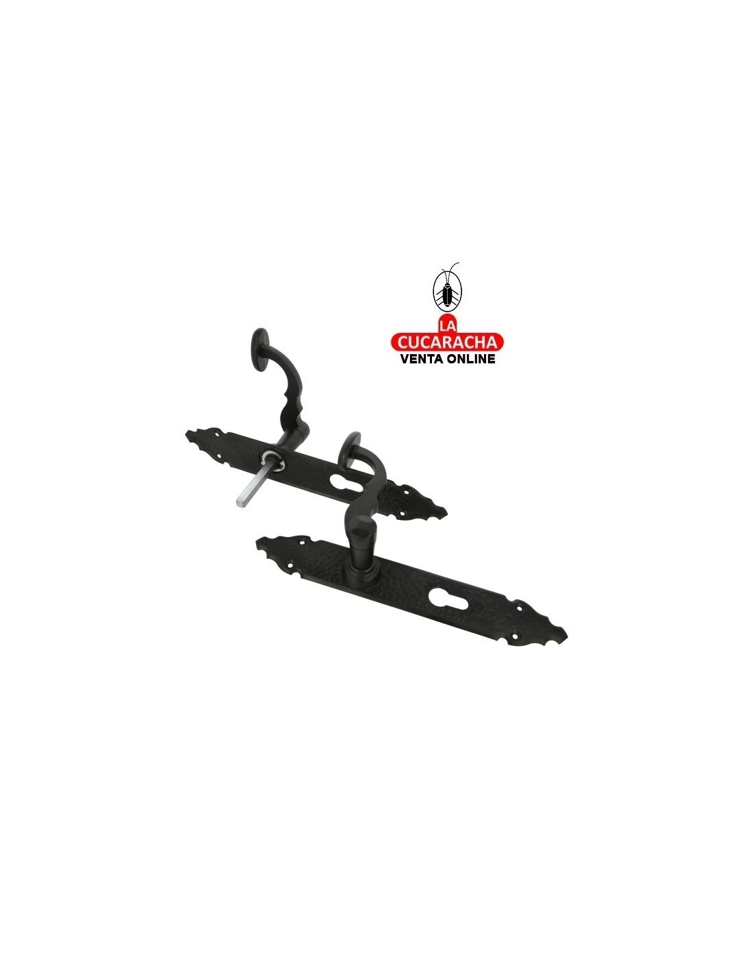 JUEGO DE MANILLAS PARA USO CON CERRADURAS DE EMBUTIR: Juego de manillas de zamak con placa martilleada de acero y bocallave troquelada para cilindro Europerfil. Su diseño en estilo forja la hace muy decorativa. En color negro, un color neutro muy combinable con cualquier color de puerta. DETALLES: Medidas: Medidas: placa de 280 x 45 x 3,5 mm. Cuadradillo de 8 mm. Fabricada en zamak, un material duro, con muy buena resistencia mecánica o a la tracción, gracias a su composición formada por la aleación de varios metales. Distancia entre nueca de manilla y alojamiento del cilindro: 70 cm. MANIJAS PRÁCTICAS Y ESTÉTICAS: Aportan un toque rústico, cálido y diferente a las puertas o portones de paso o entrada, a la vez que facilitan la apertura y el cierre. Su mango artístico es estético y práctico a partes iguales. UNIÓN SÓLIDA Y DURADERA: Cuenta con orificios avellanados para que los tirafondos queden perfectamente colocados al ras, garantizando una unión duradera.