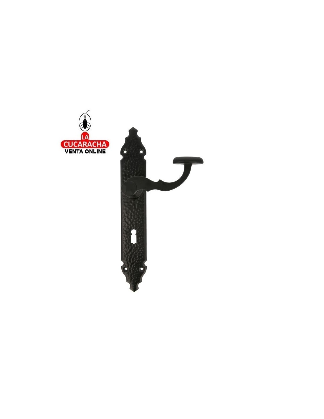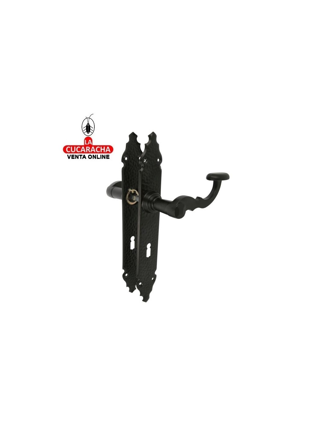 Juego de manillas de zamak con placa martilleada de acero. Con boca llave troquelada para cerradura con llave de gorja. Cuadradillo de 8 mm.