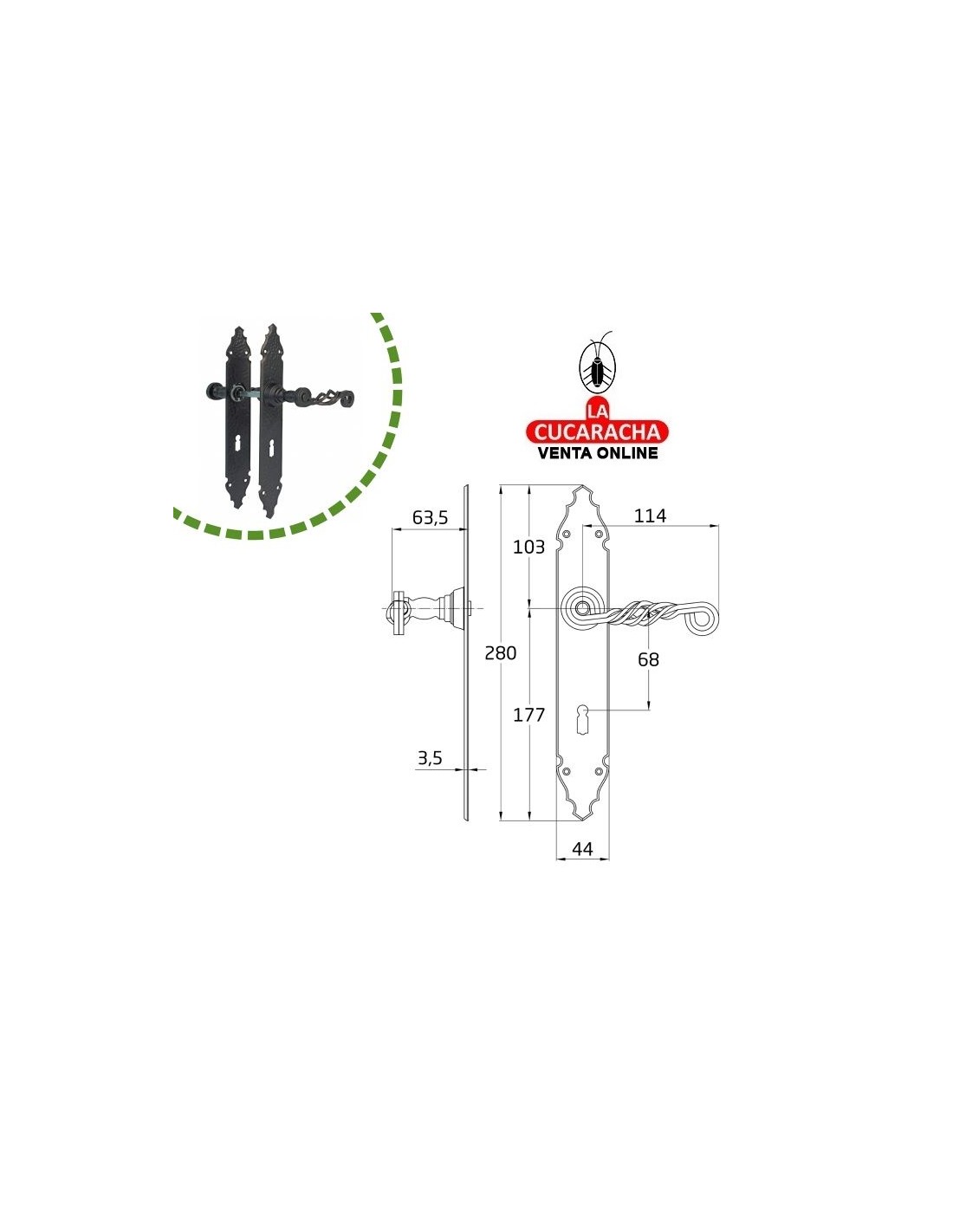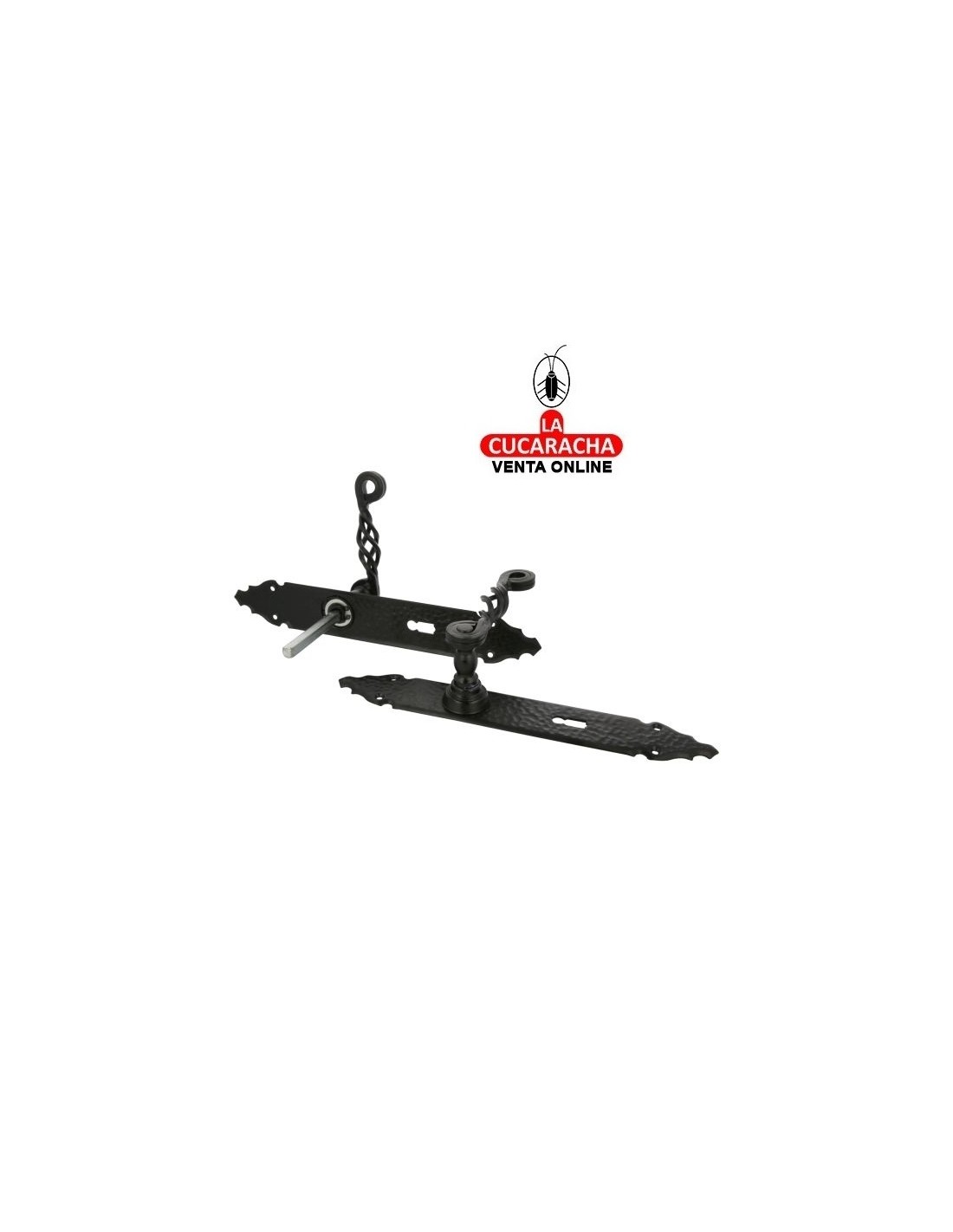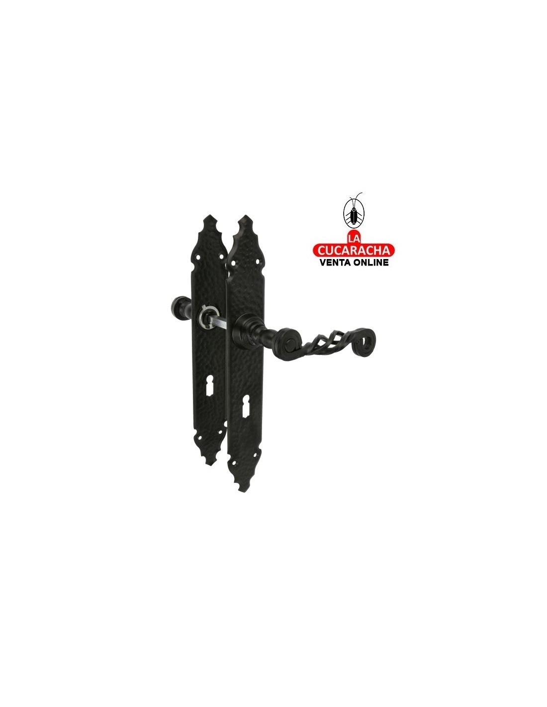 JUEGO MANILLAS PUERTA RUSTICO ZAMAK PLACA MARTILLEADA ACERO BOCALLAVE MODELO 102PG.