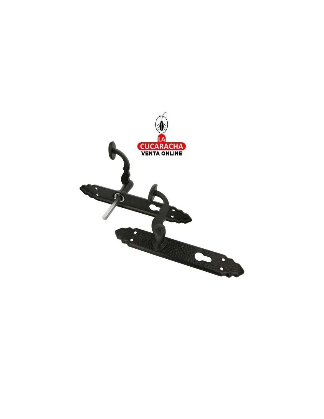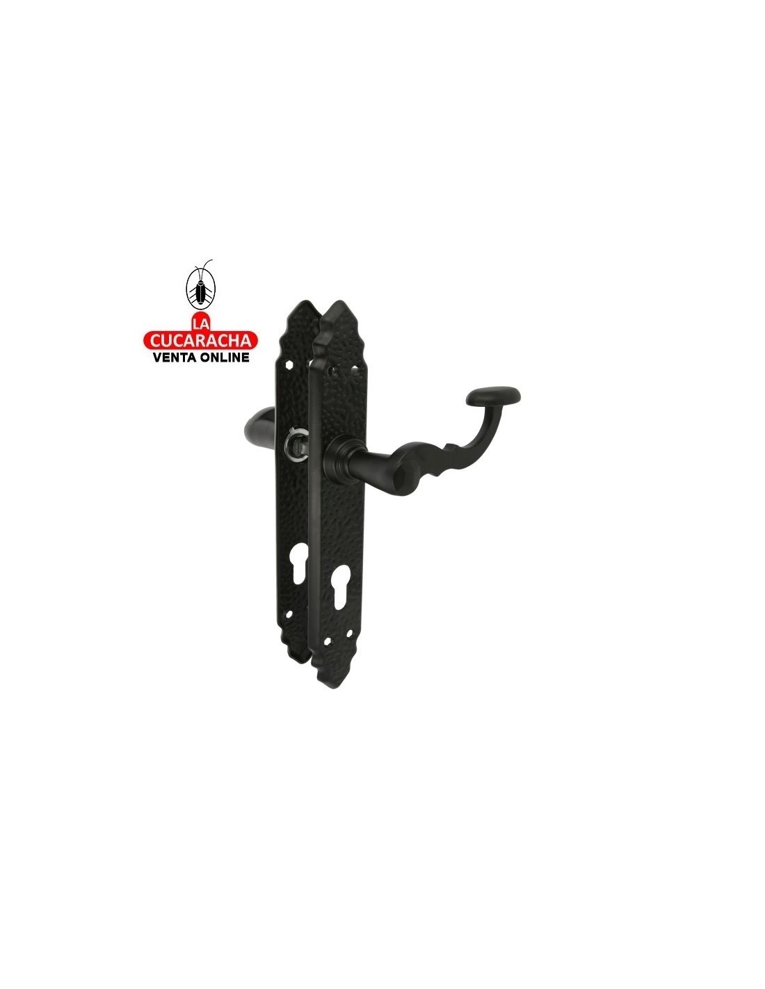 JUEGO MANILLAS PUERTA RUSTICO ZAMAK PLACA MARTILLEADA ACERO BOCALLAVE MODELO 100PEB AT.