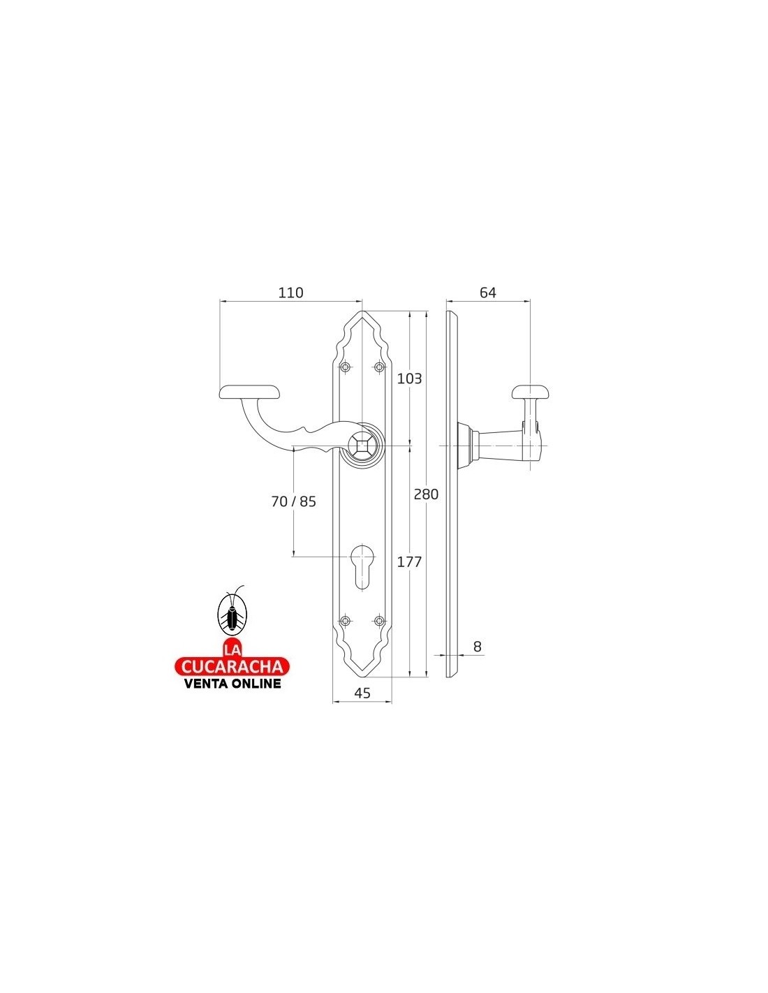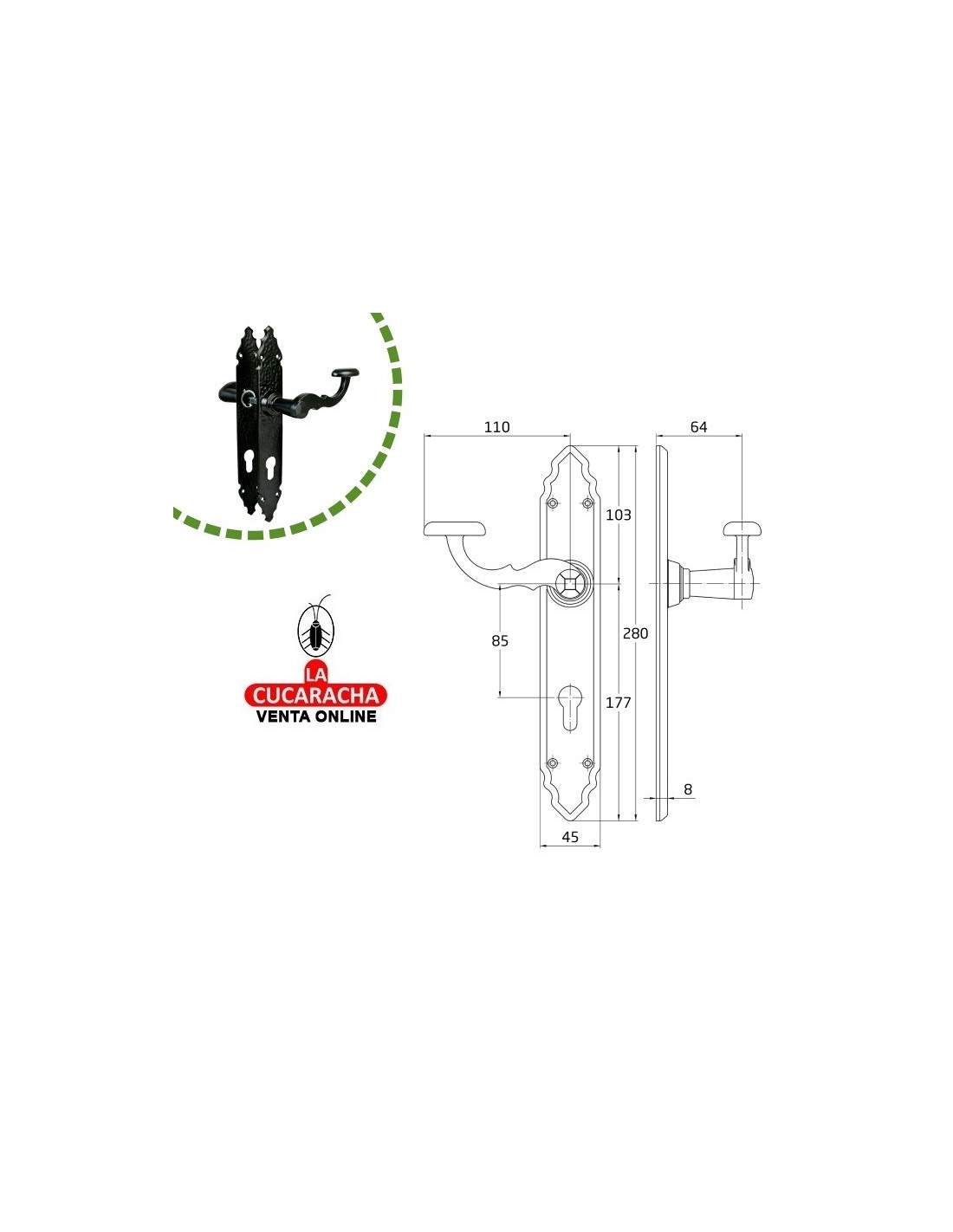 Manilla de zamak con placa martilleada de acero. Con bocallave troquelada para cilindro Europerfil a 85 mm. Colocación en puertas de entrada con escudo de seguridad modelo 30 o 31. Cuadradillo de 8 mm. Incluye tornillos pasantes antirrobo.