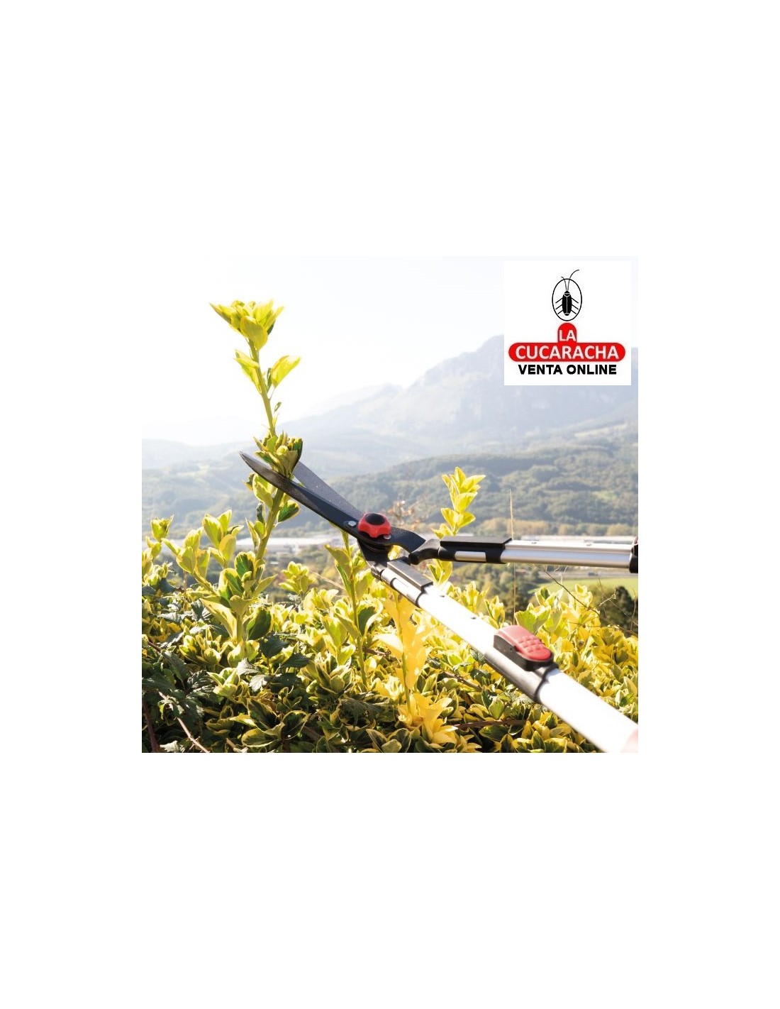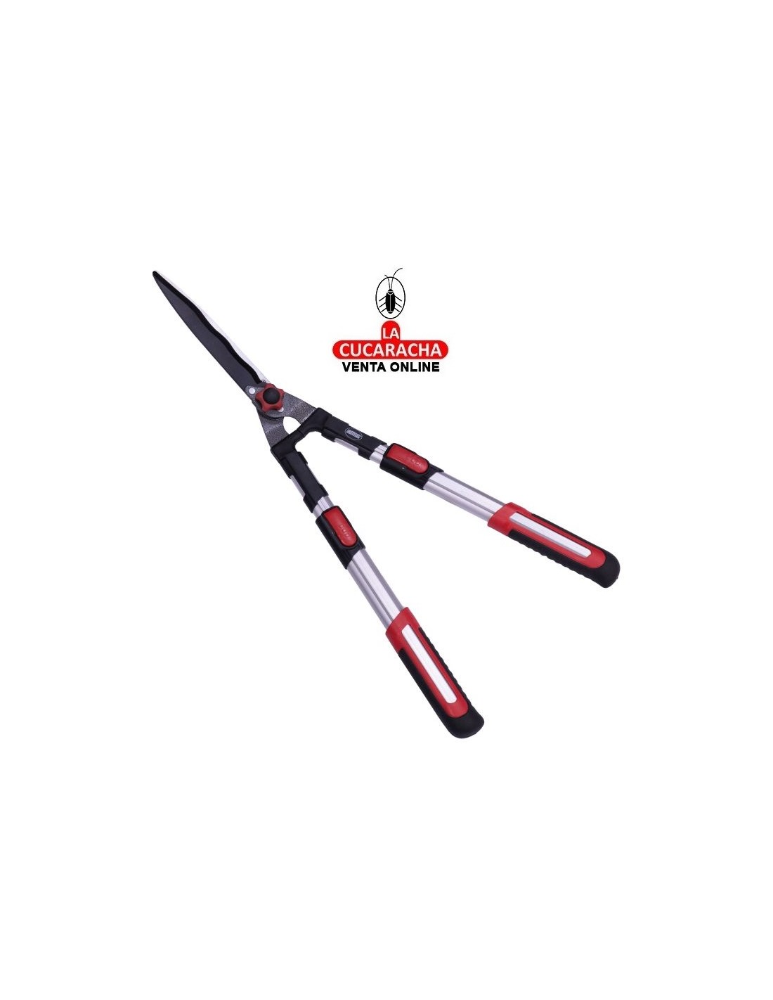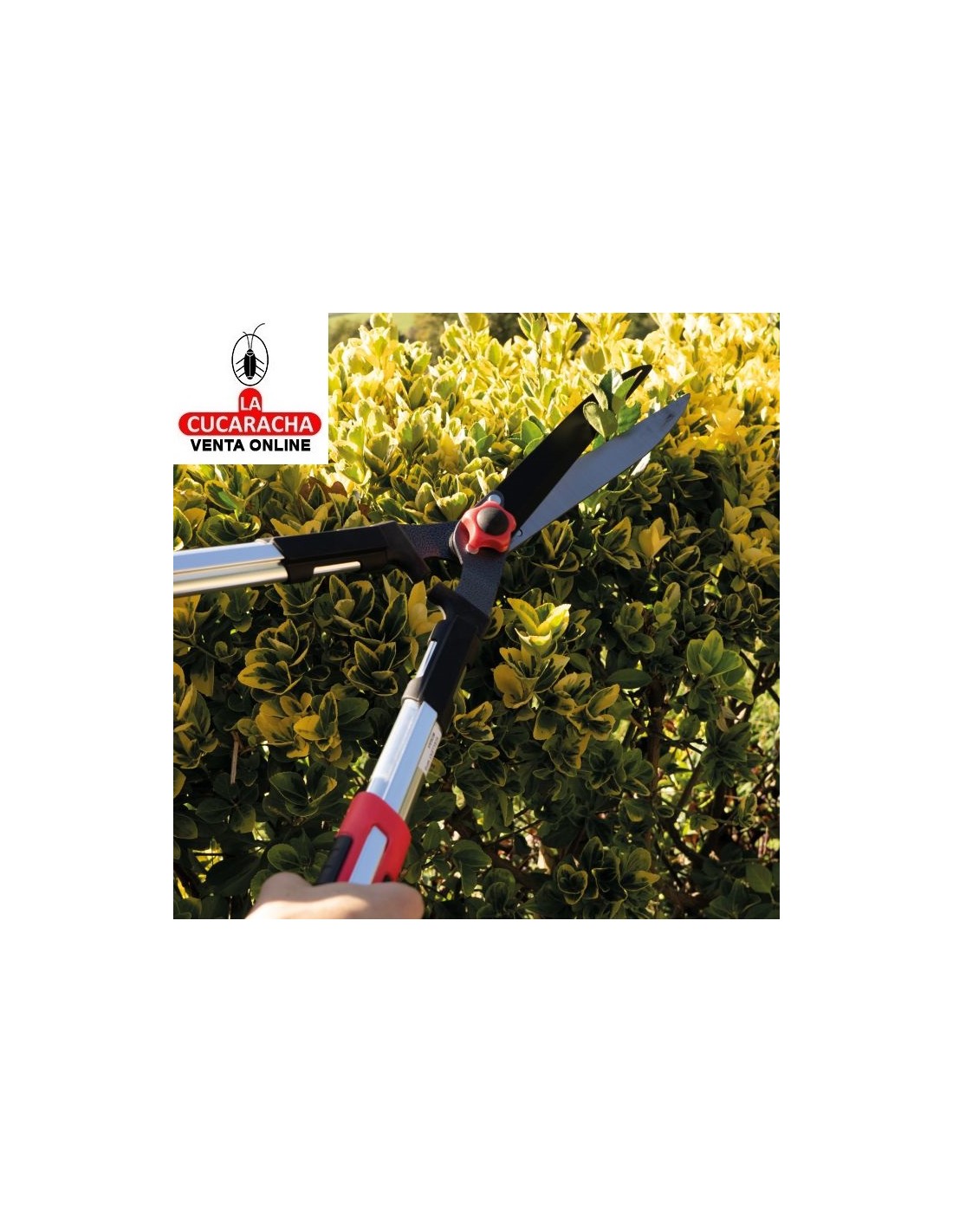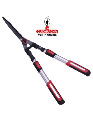 Tijera cortasetos a dos manos. Hoja de acero templado con revestimiento antiadherente de teflón. Filo ondulado que permite agarrar bien la rama y cortarla sin problemas. Mangos telescópicos de longitud de 68 a 88 cm. Mangos de aluminio ligeros y resistentes. Empuñaduras ergonómicas y antideslizantes. Topes amortiguadores integrados.