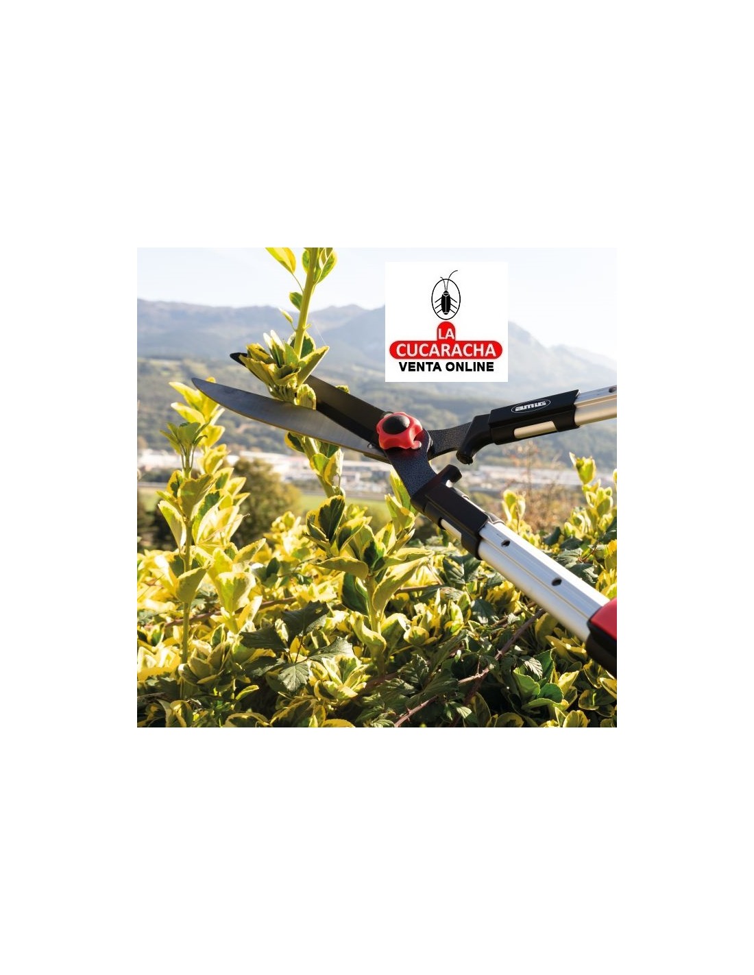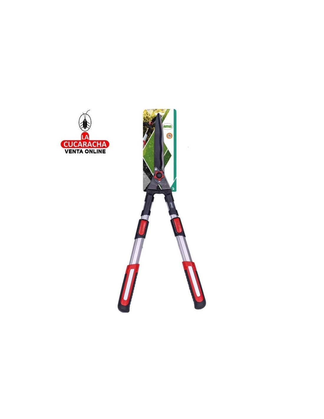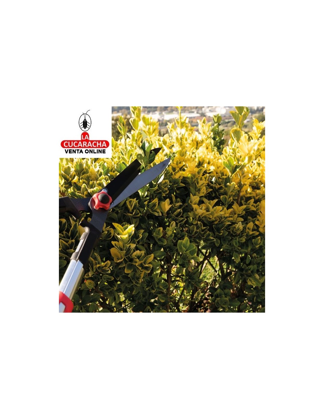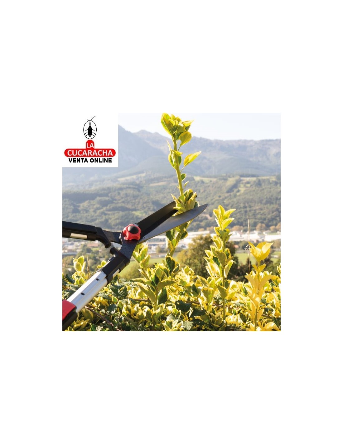 Tijera cortasetos a dos manos. Hoja de acero templado con revestimiento antiadherente de teflón. Filo ondulado que permite agarrar bien la rama y cortarla sin problemas. Mangos telescópicos de longitud de 68 a 88 cm. Mangos de aluminio ligeros y resistentes. Empuñaduras ergonómicas y antideslizantes. Topes amortiguadores integrados.