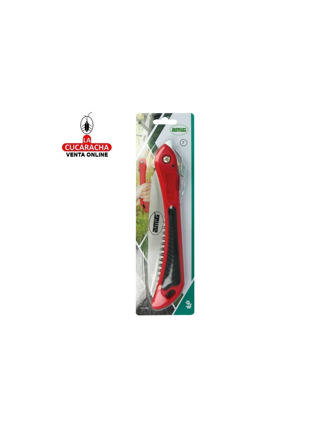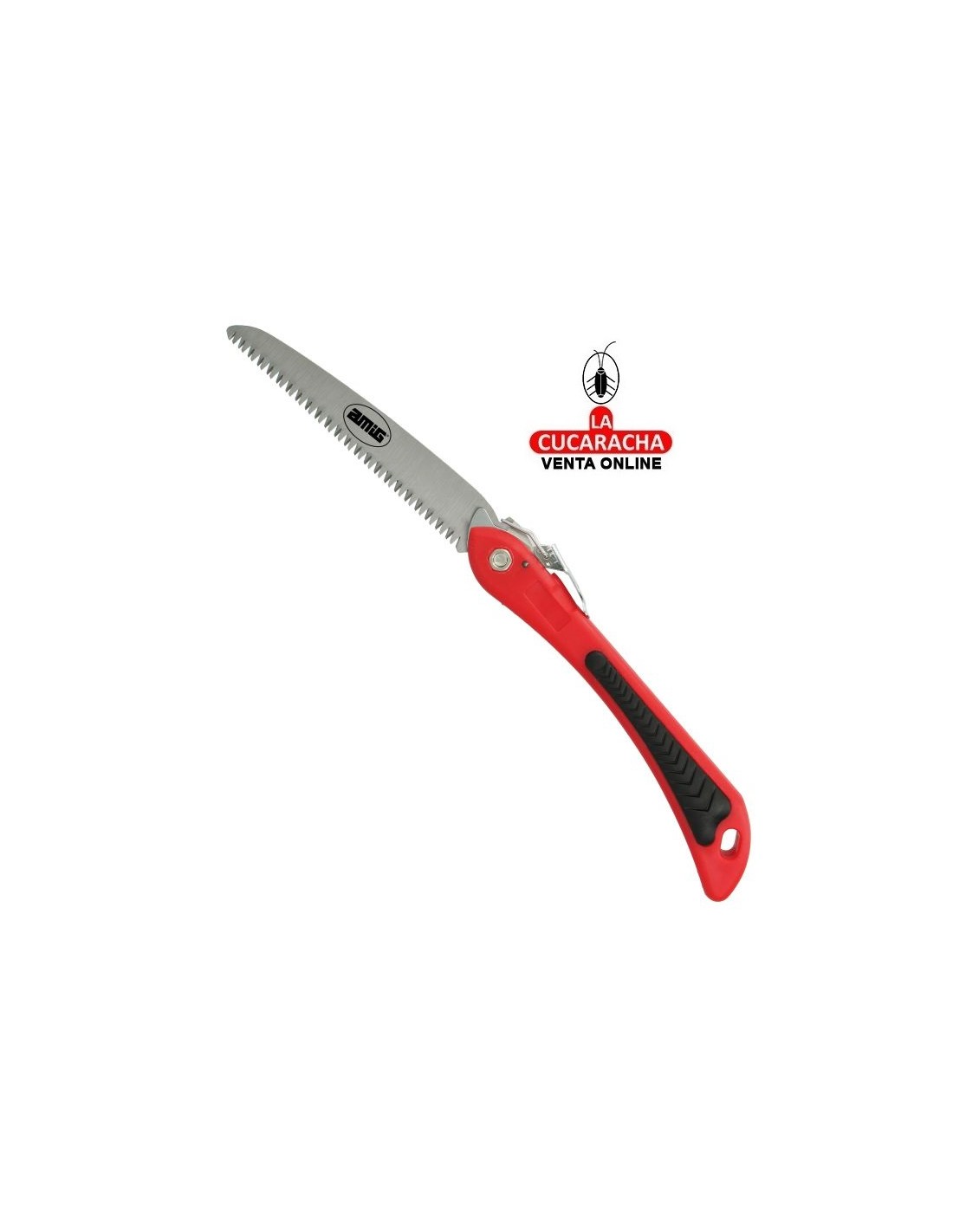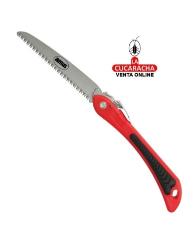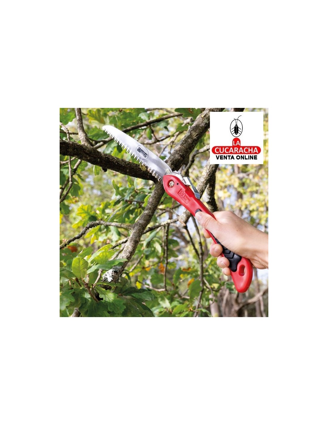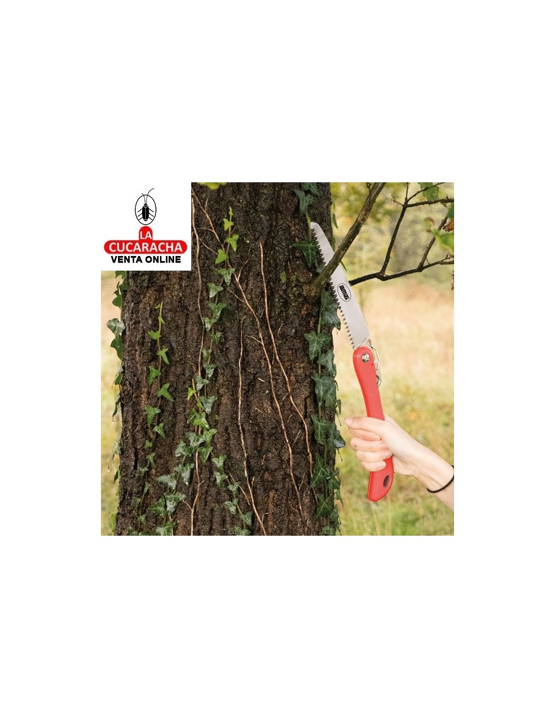 Serrucho de poda plegable con mango de ABS. Dentado afilado por tres caras para mayor facilidad y limpieza de corte. Sistema de seguridad para evitar el cierre accidental de la hoja. Mango bimaterial antideslizante.