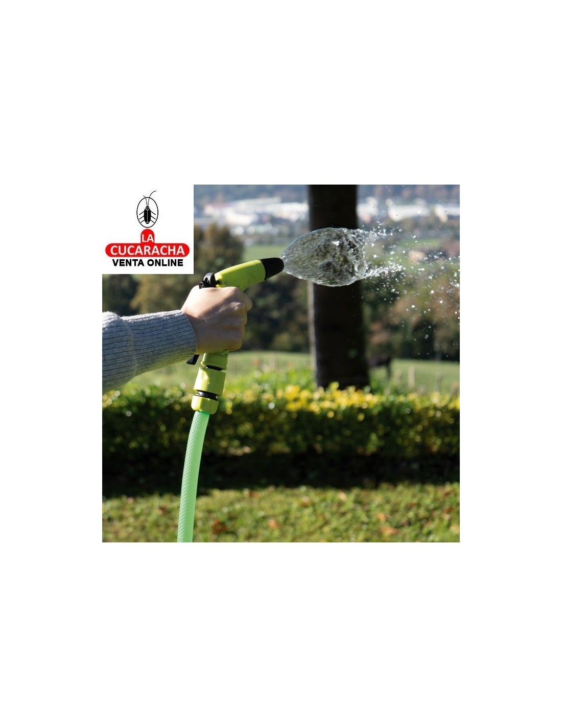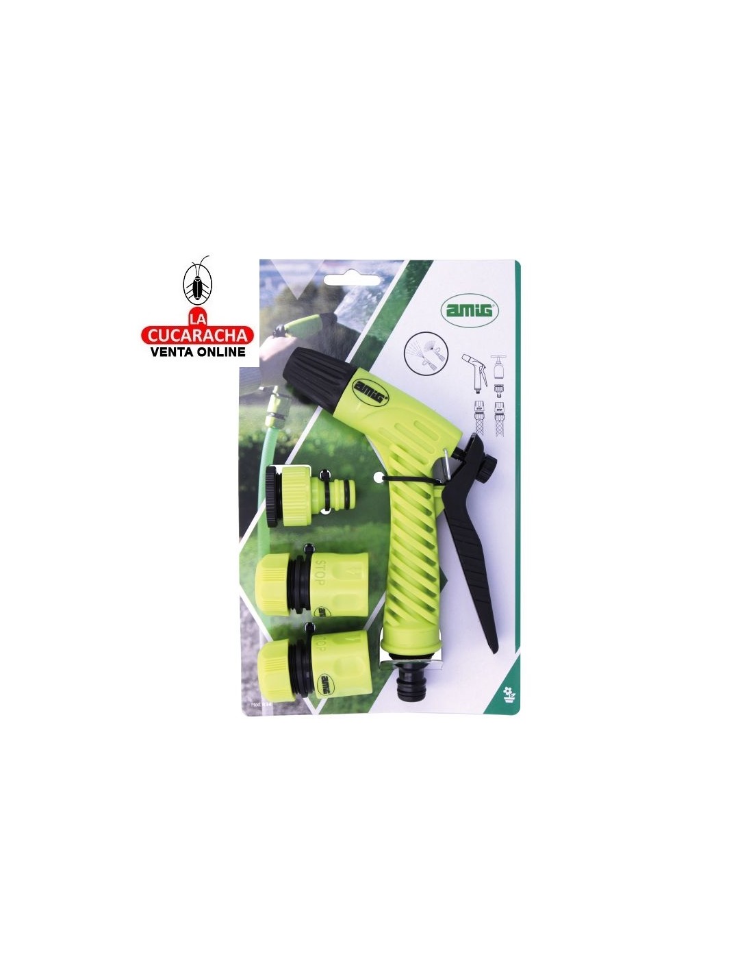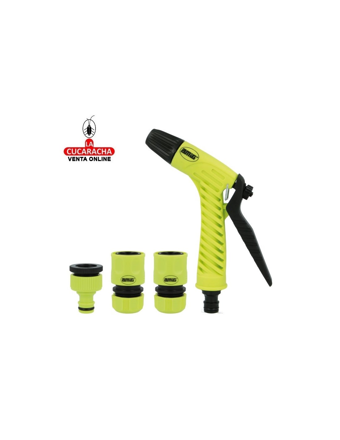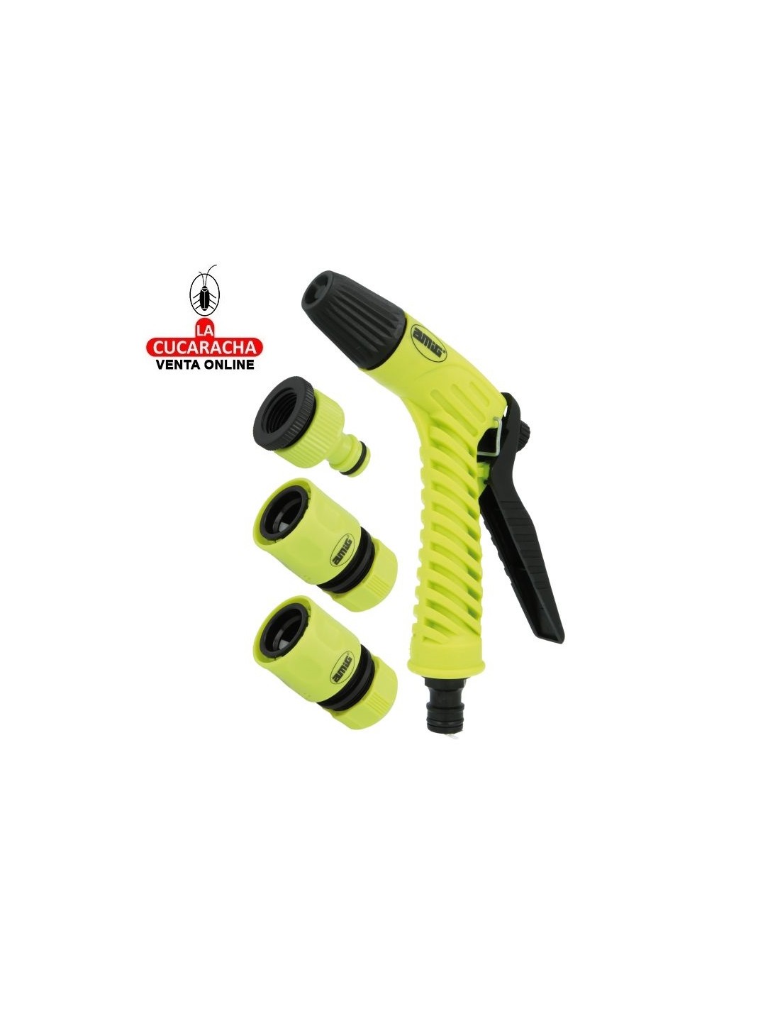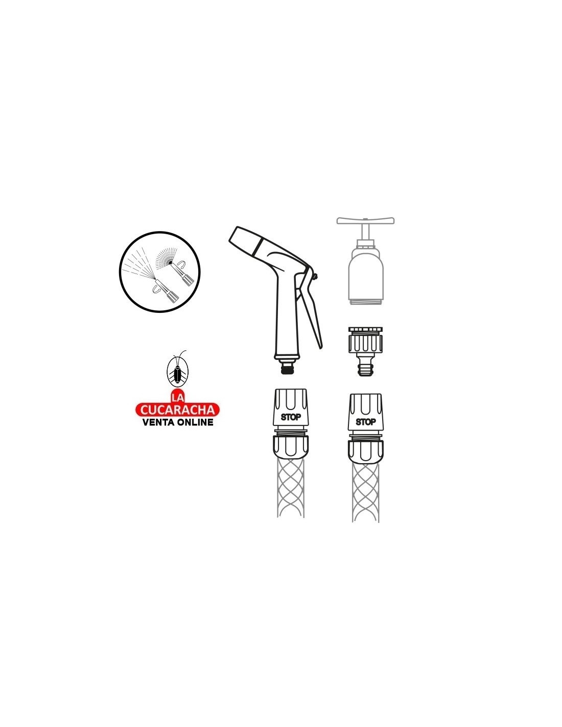 Kit de riego fabricado en ABS. 1 pistola de riego. 1 adaptador+reductor 1/2''-3/4''. 2 empalmes rápidos de manguera de 1/2'' y 3/4''. Con función Stop.