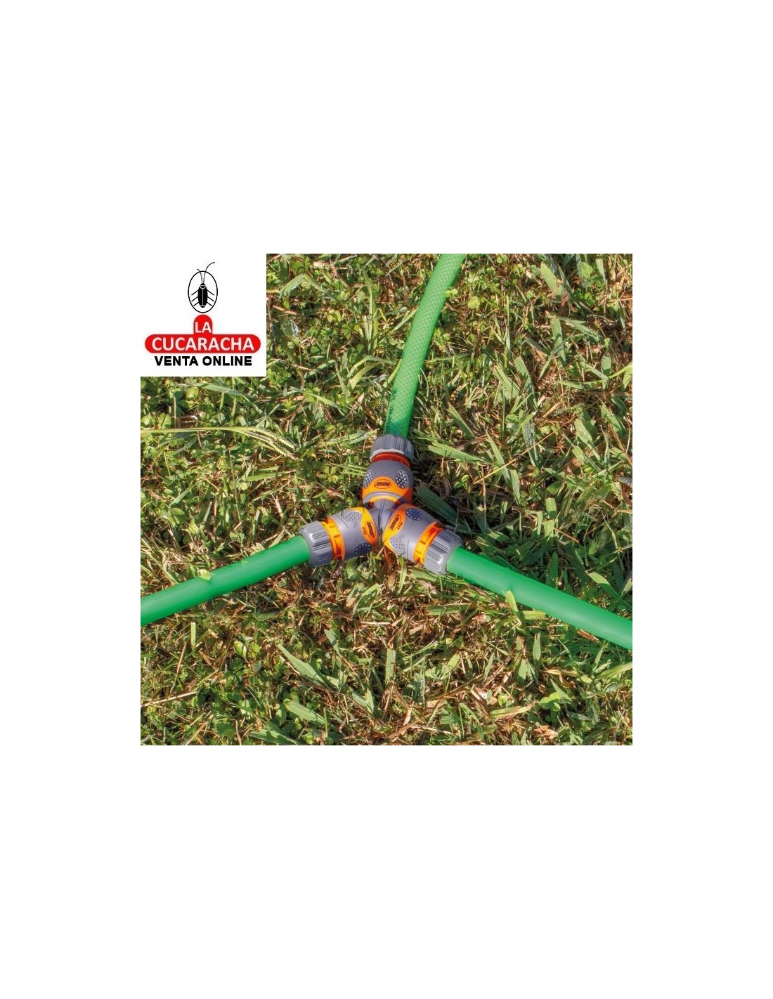 Derivación triple de mangueras. Fabricado en plástico ABS de alta calidad. Para conectores rápidos de las mangueras. Divide un flujo de agua en dos direcciones diferentes.