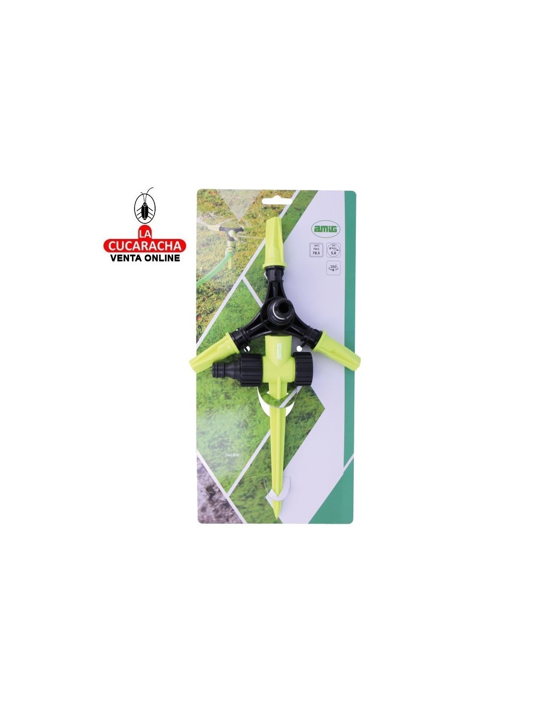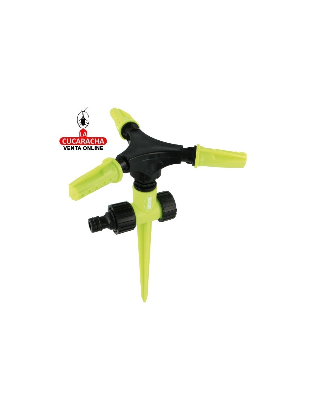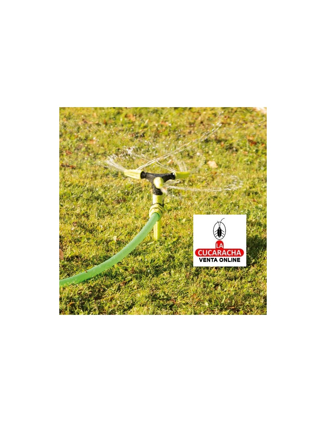 Aspersor rotativo con 3 brazos giratorios. Fabricado en ABS de alta calidad. Con conector rápido. Superficie de riego 78,5 m².