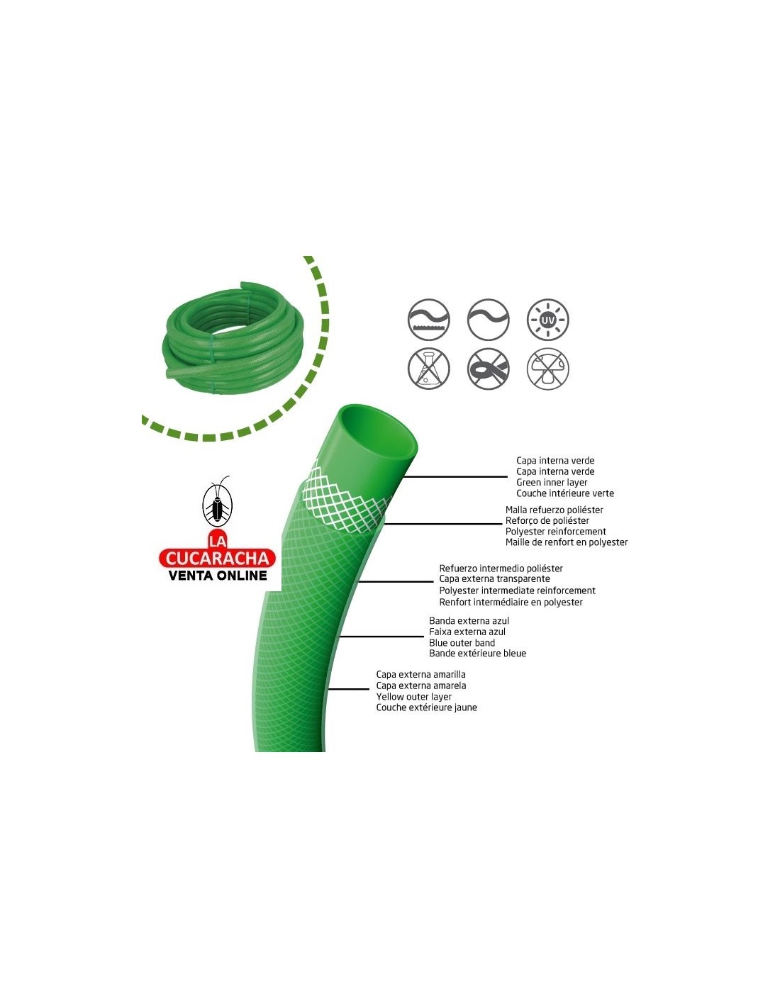Kit de manguera trenzada flexible de Ø15 mm x 15 m de PVC de triple capa y refuerzo de poliéster que le da una gran flexibilidad y resistenciaa la presión.