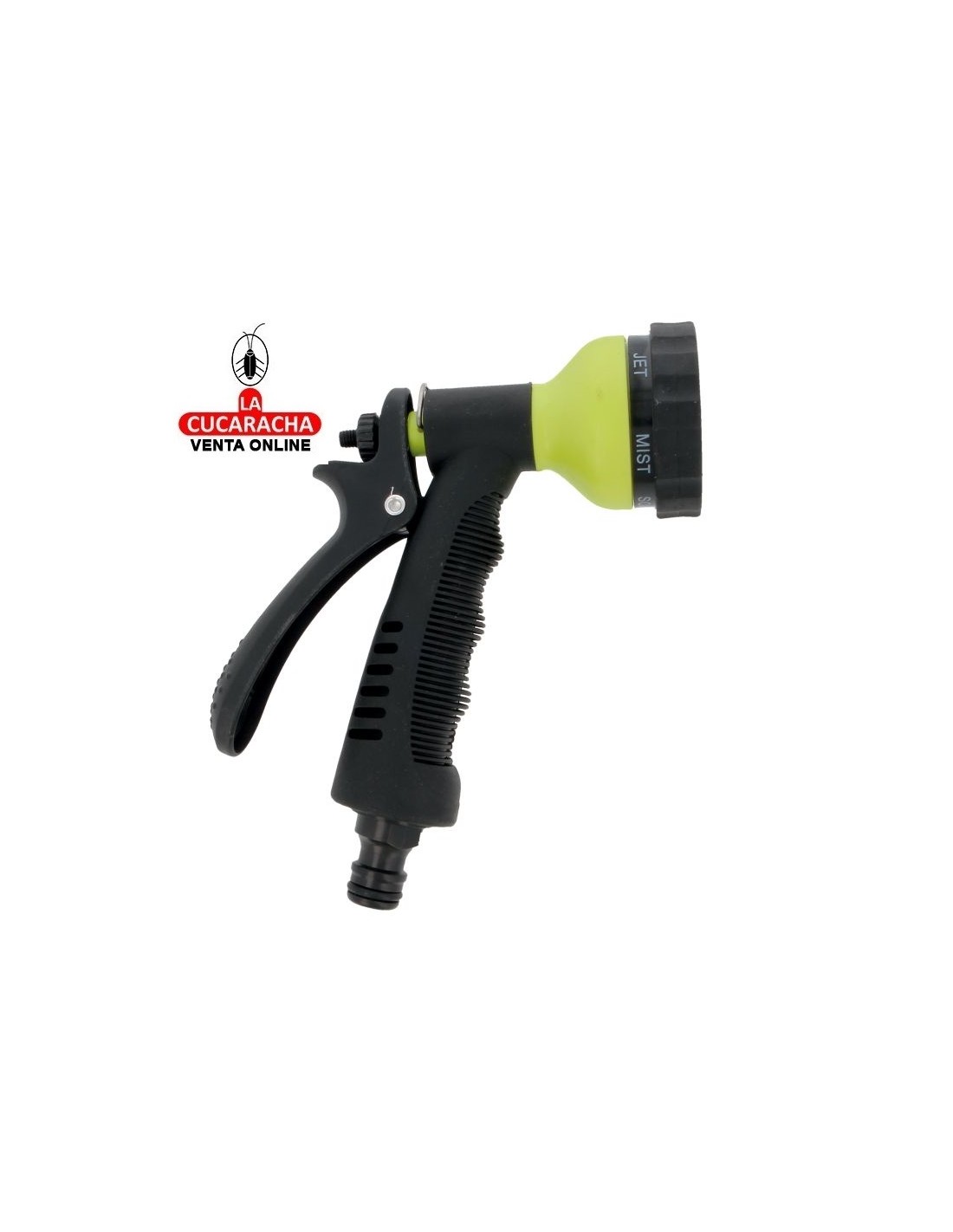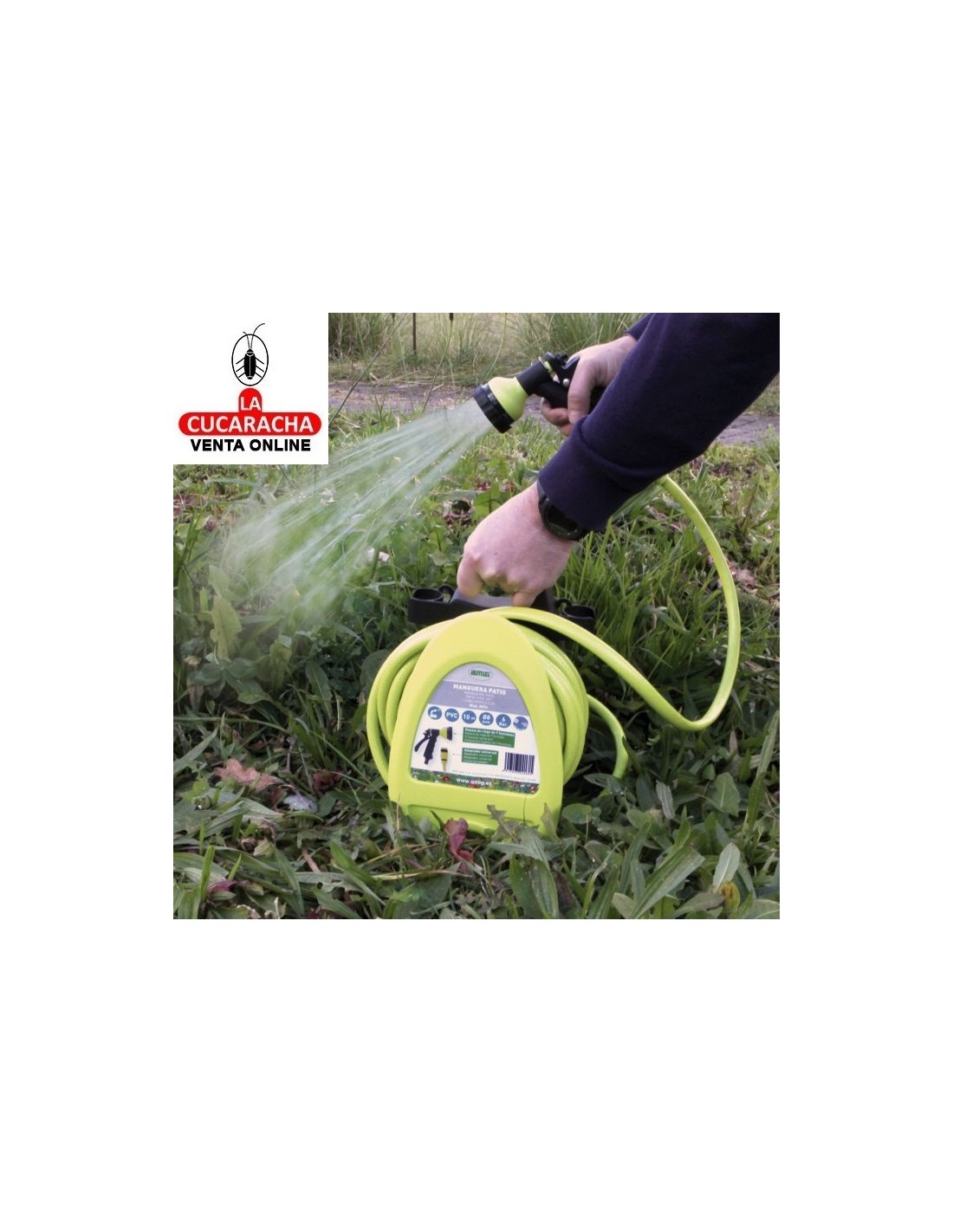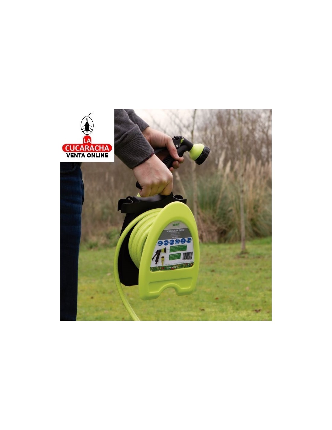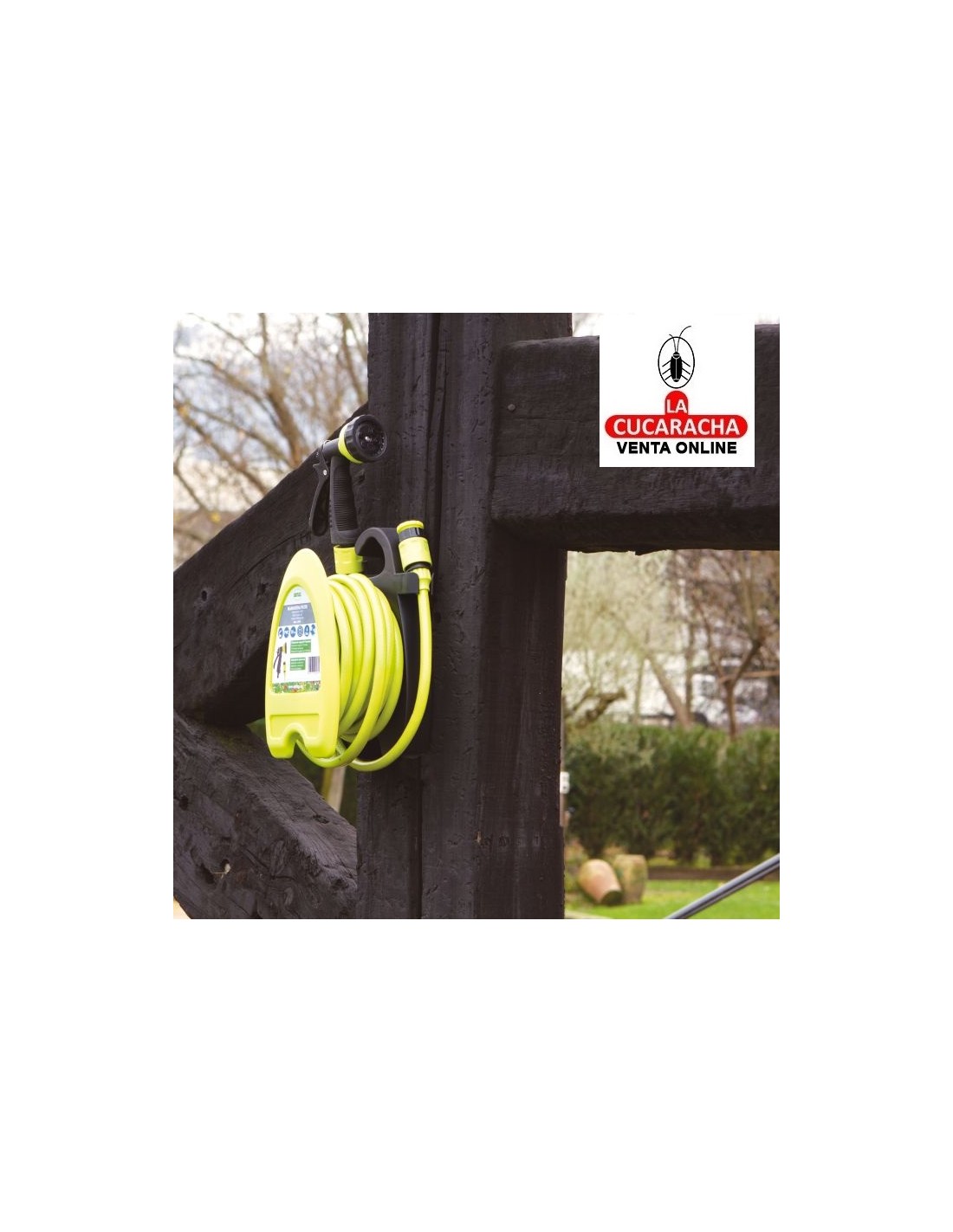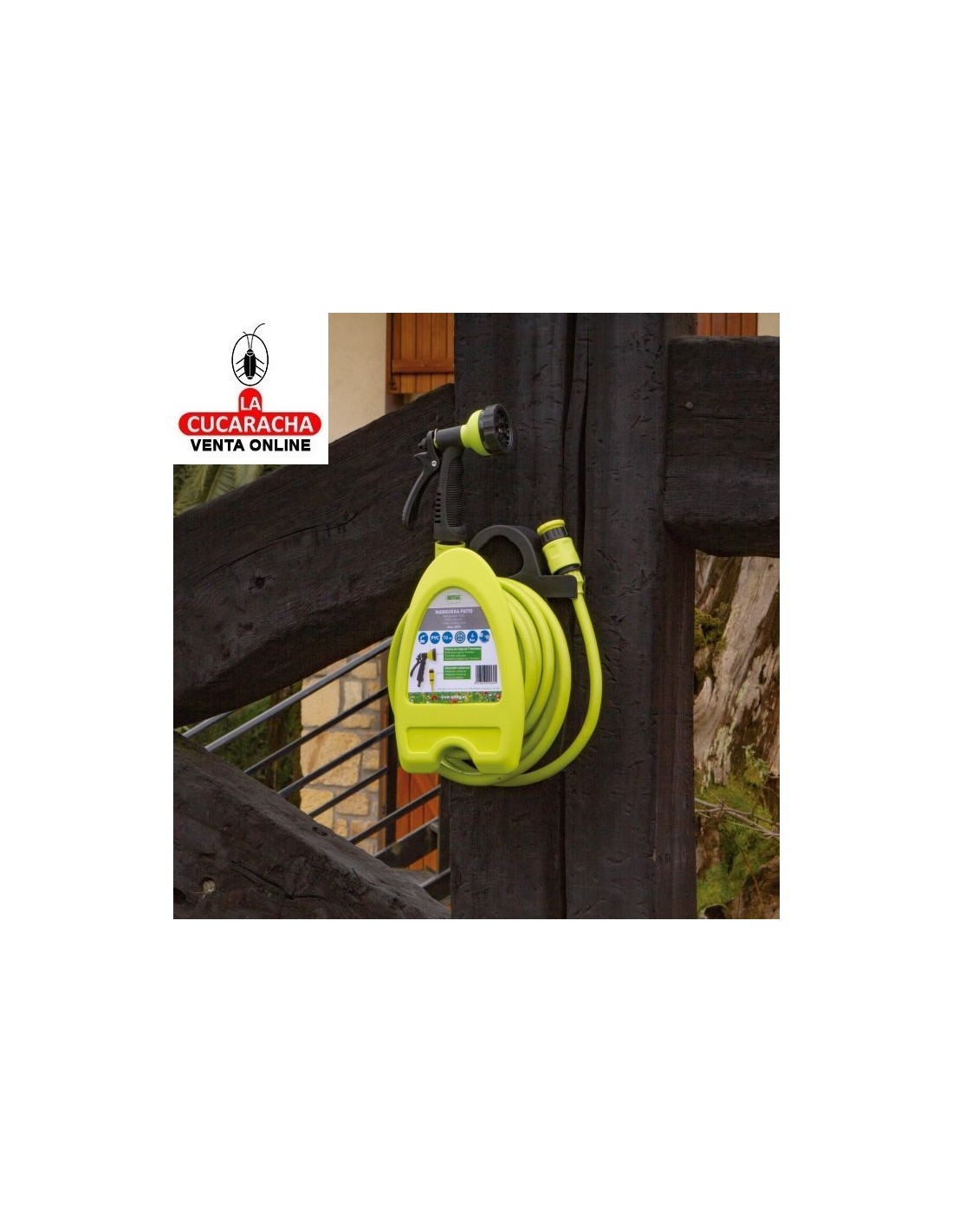 Manguera de patio de PVC. Conector de grifo universal regulable. Pistola de riego de 6 funciones. Soporte para colgar. Asa para transportar.