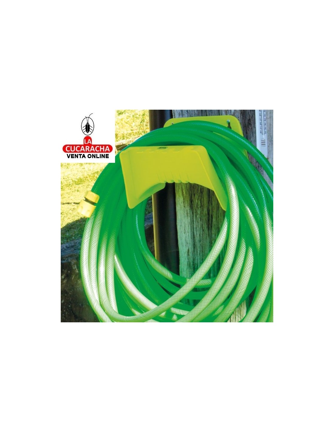Soporte de manguera pared. Fabricado en plástico muy resistente y ligero. Para mangueras de jardín de hasta 10 metros. Manguera no incluida.