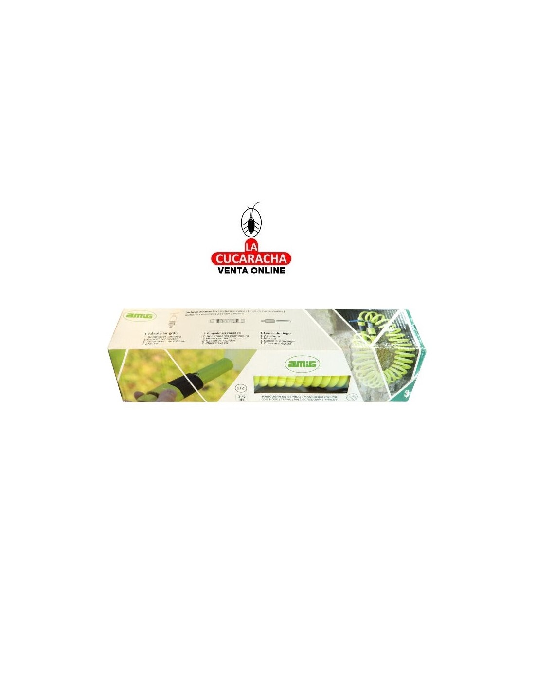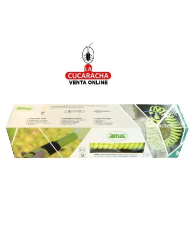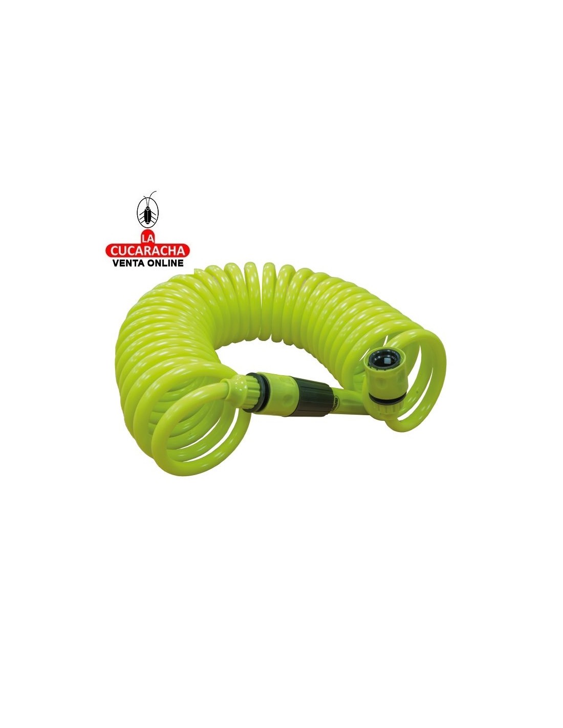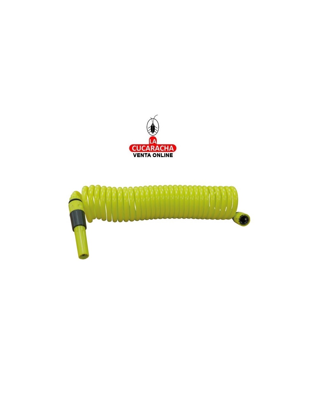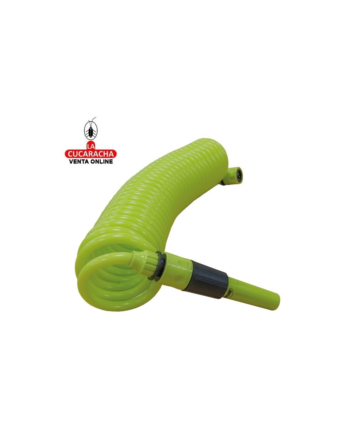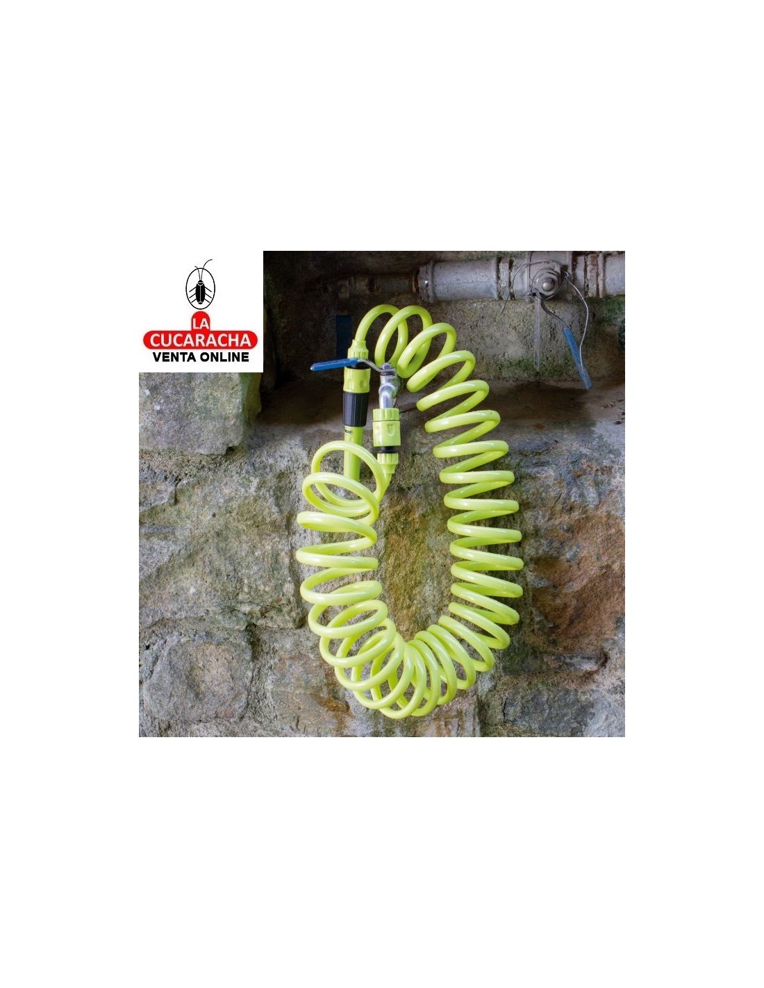 Manguera en espiral de 3/8''. Incluye accesorios. Lanza de riego. Adaptador grifo. 2 empalmes rápidos.