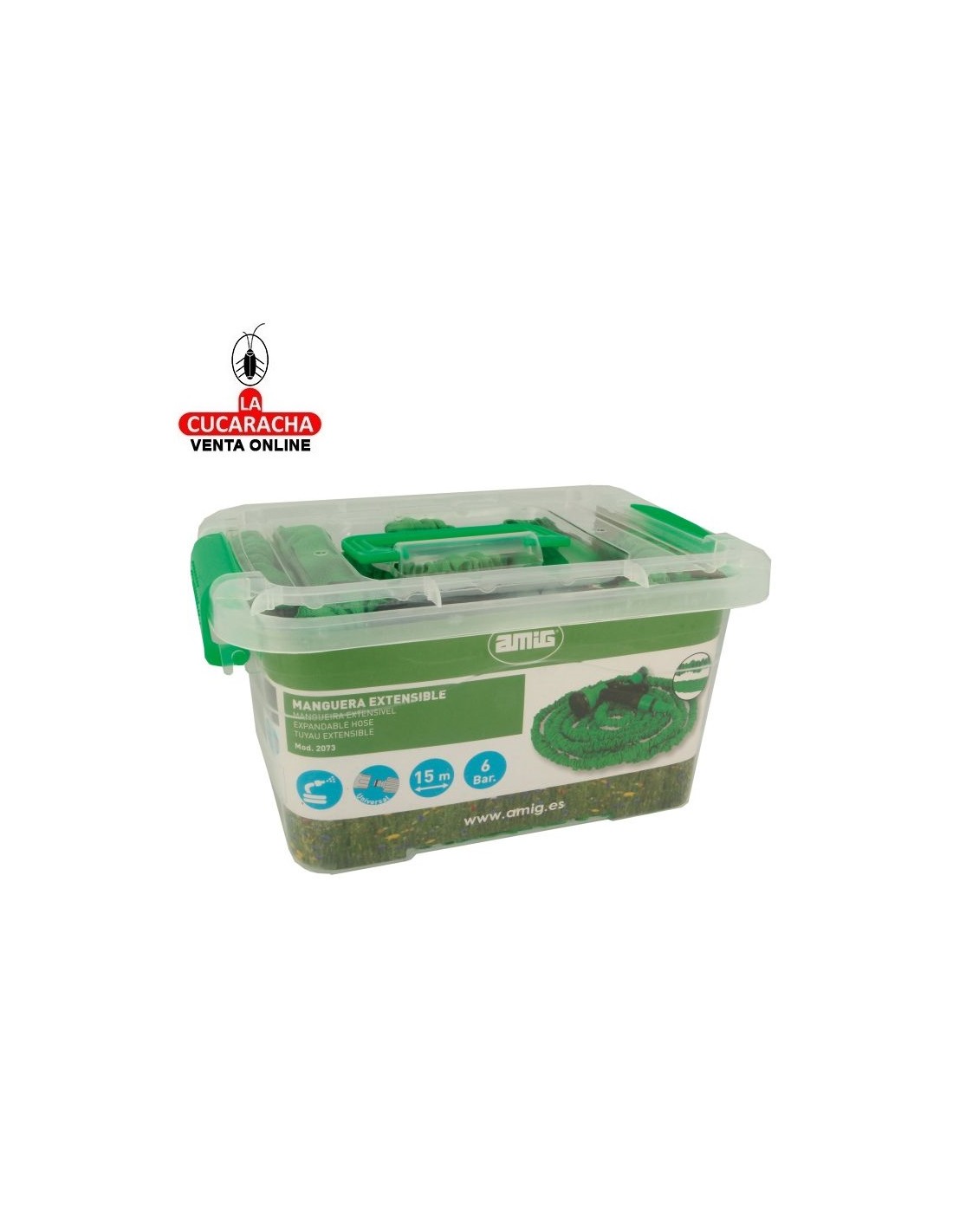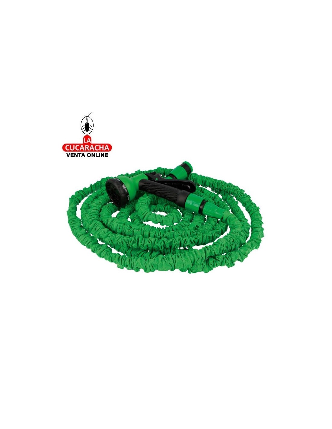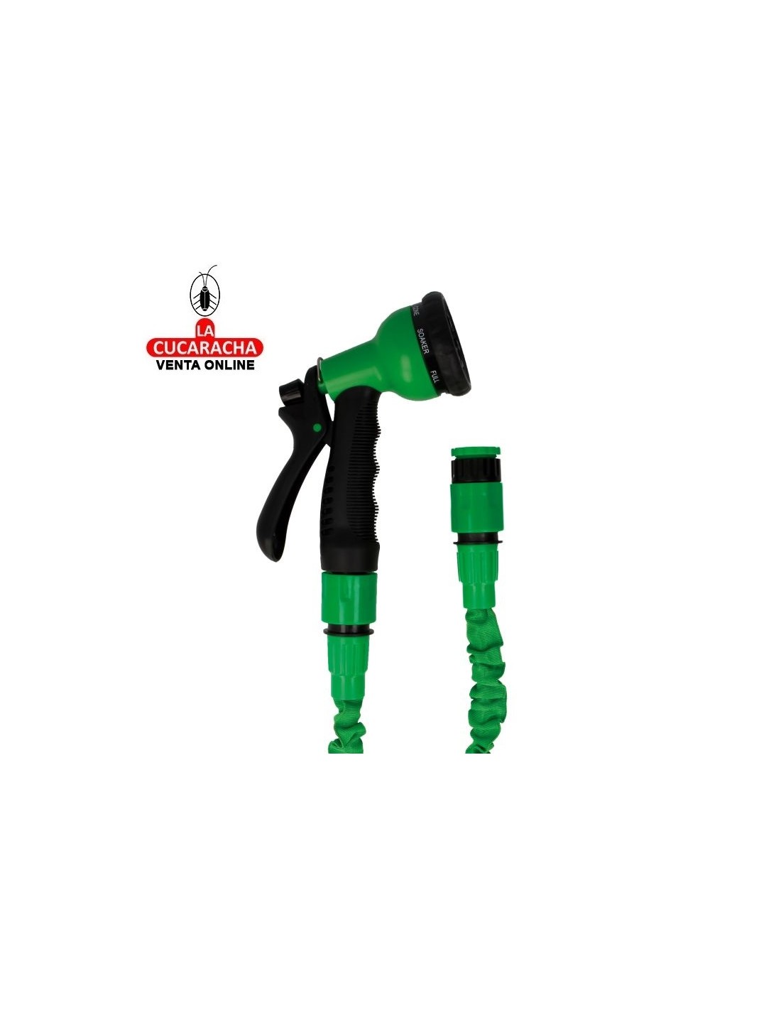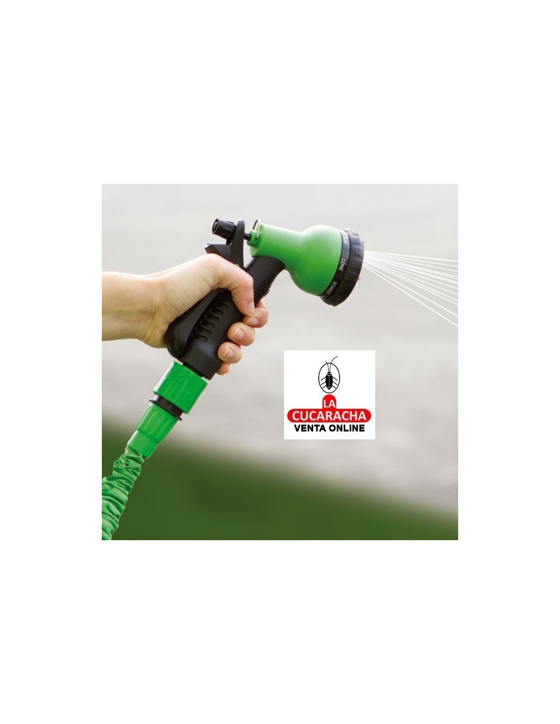Manguera extensible de doble látex en color verde. Alcanza hasta 15 metros de longitud. Presión máxima hasta 6 bar. Pistola de riego de 8 funciones. Incluye accesorios.