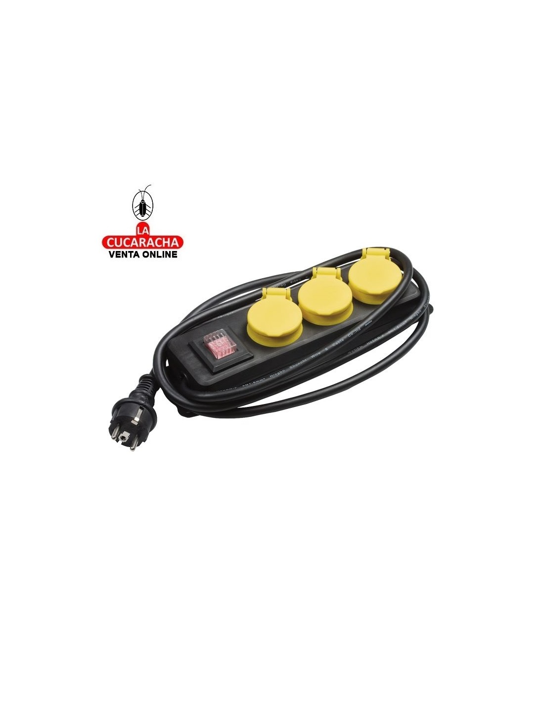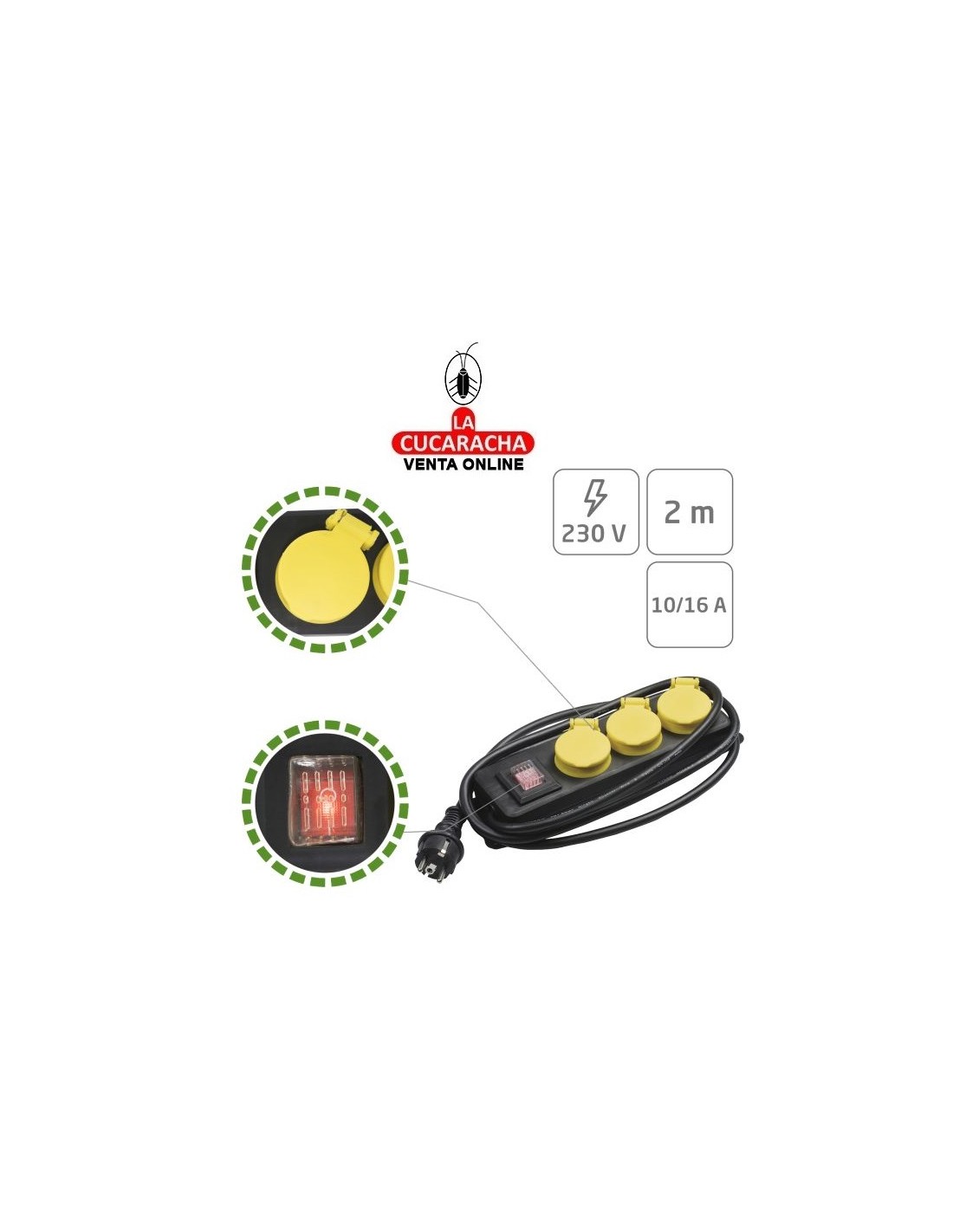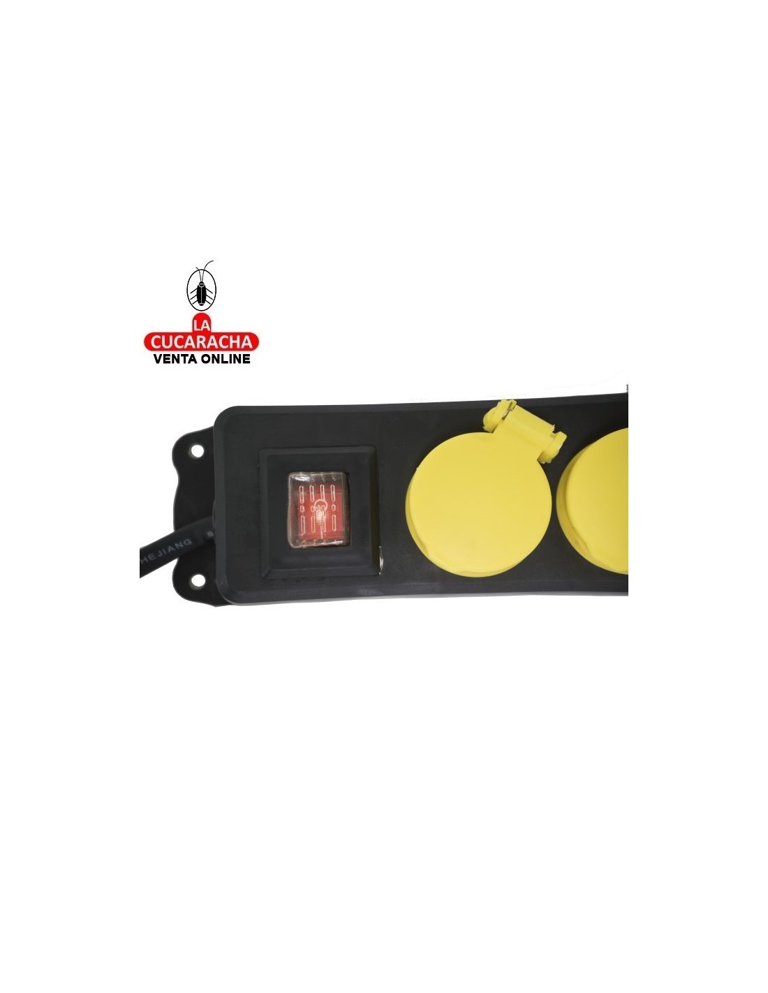 DESCRIPCIÓN: Base múltiple con 3 enchufes con tapa de seguridad estanca abatible IP44 y toma de tierra. Apto para colocar en interiores y exteriores. Con interruptor y cable de alimentación de alta resistencia y durabilidad, y enchufe en el extremo para obtener un alcance óptimo. DETALLES: Amperaje máximo 10/16 A. Voltaje máximo 230 V. Cable 3G 1,5 mm² de 2 m de longitud. Clase de protección: IP44 (protección contra cuerpos extraños y salpicaduras en exteriores). Material: Polipropileno, de buena resistencia y estabilidad térmica. Color: Negro y amarillo. USOS: Regleta estanca adecuada para uso en exteriores e interiores como casas, oficinas, talleres, jardines, terrazas, porches, obras, etc. Perfecta para conectar al mismo tiempo varios electrodomésticos, ordenadores, impresoras, lámparas…en un solo lugar. MATERIALES DE CALIDAD: Material duradero para asegurar su resistencia al calor. Gracias a su circuito de cobre, admite el uso de productos de potencia hasta los 3680W, una gama más amplia de aplicaciones.