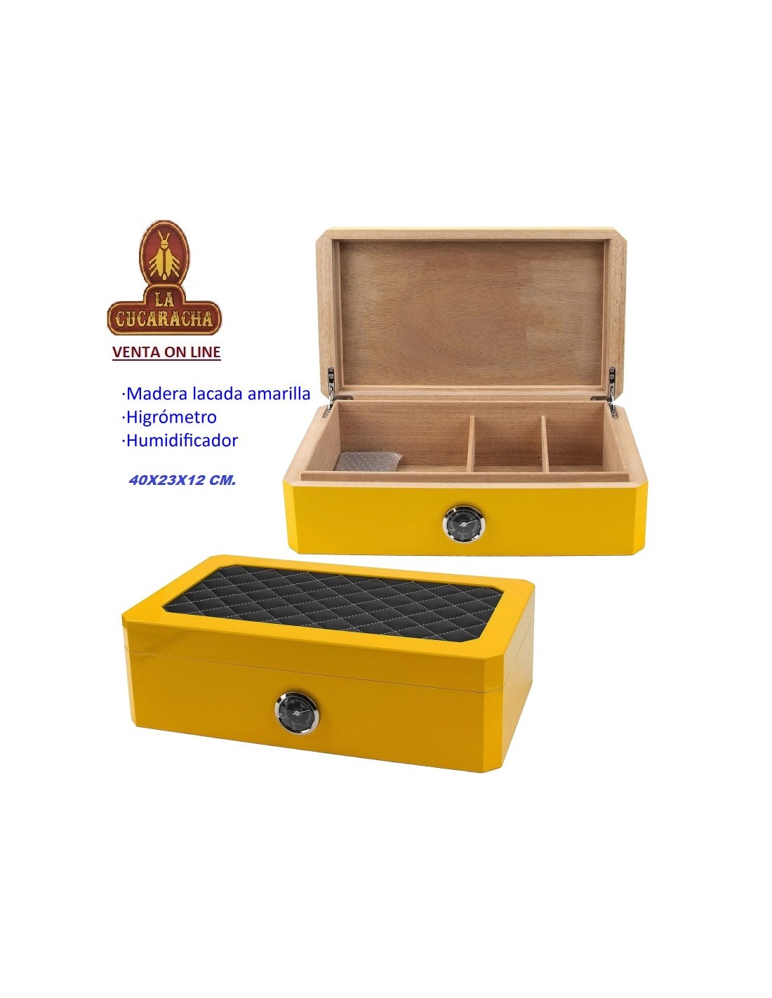 Humidor madera lacado amarillo con higrómetro y humidificador 40 x 23 x 12 cm.