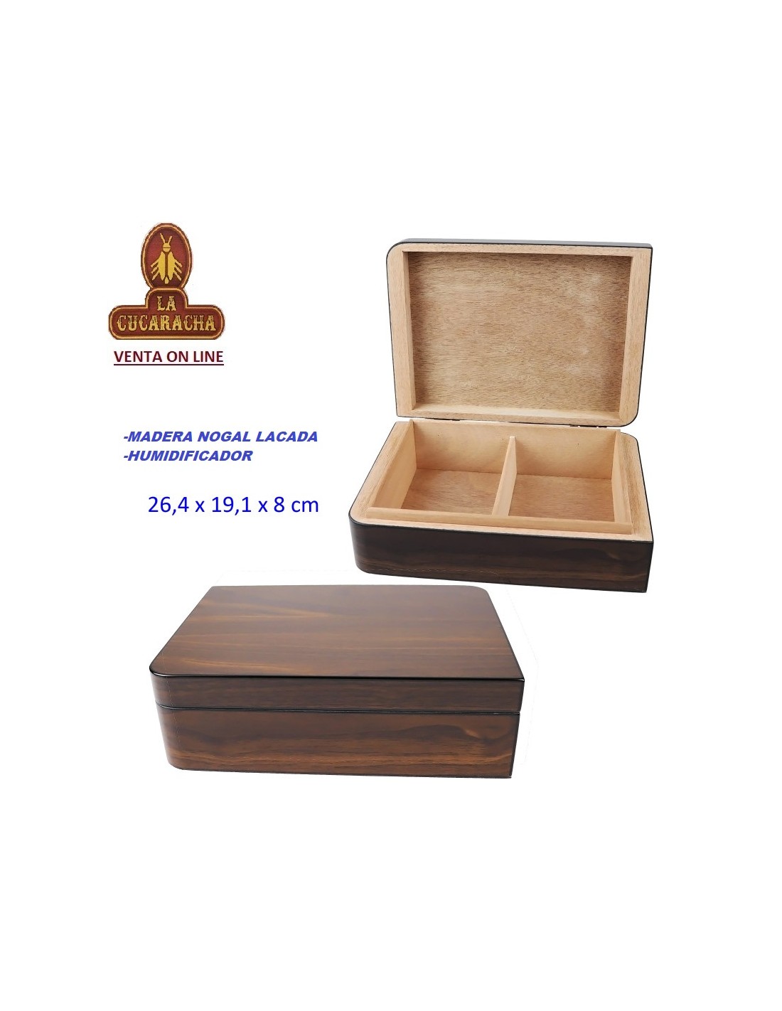 Humidor madera nogal lacada con humidificador 26,4 x 19,1 x 8 cm.