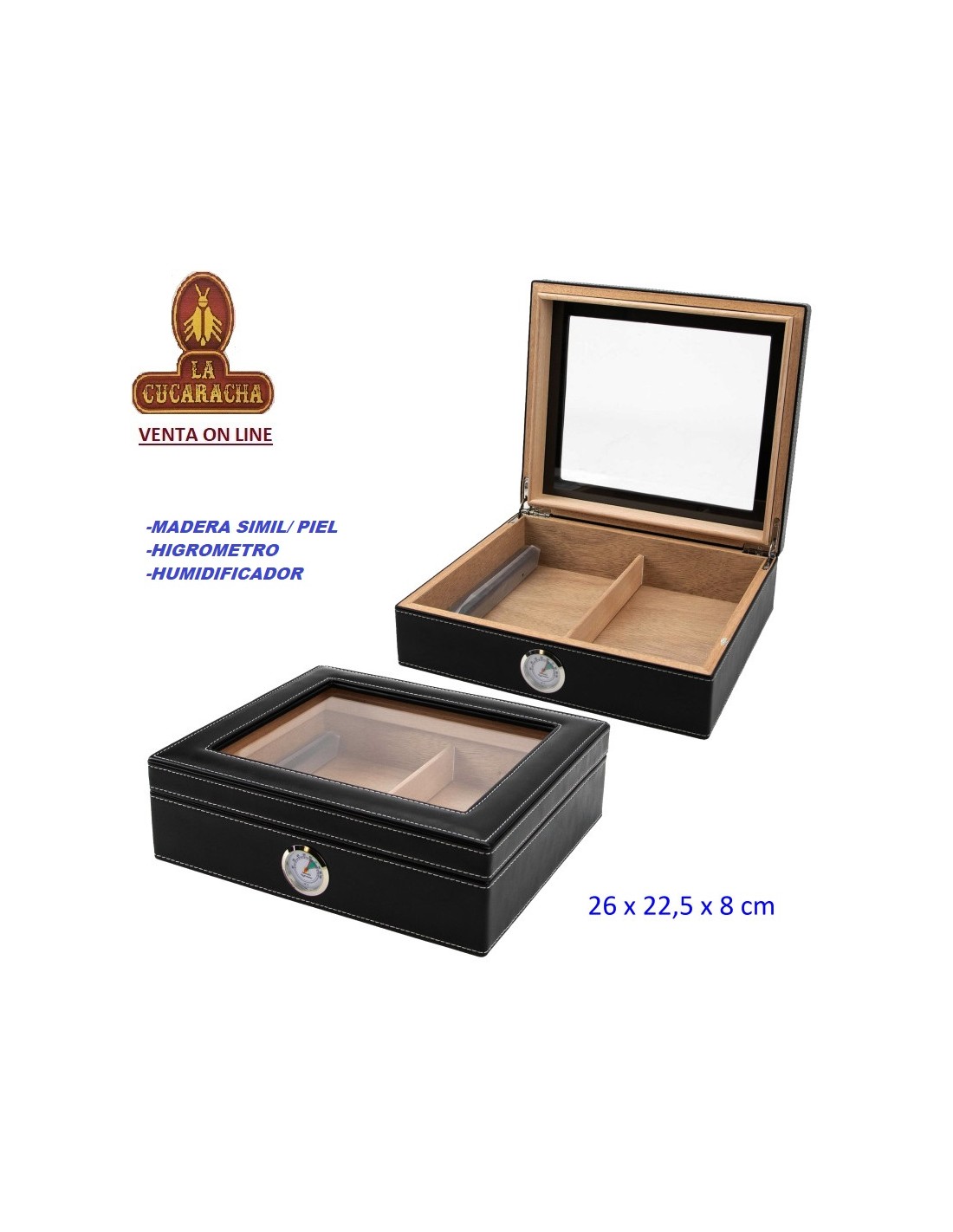 Humidor madera. Exterior simil piel. Con higrómetro y humidificador 26 x 22,5 x 8 cm.
